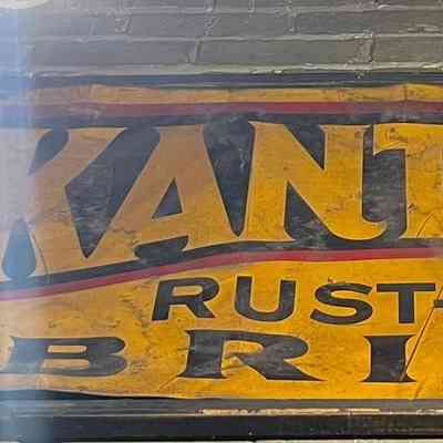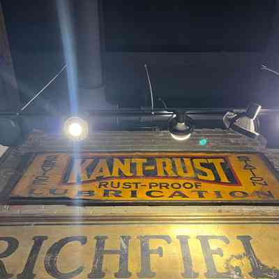 The circa 1935 production sign is screen-printed on tin with a wood frame.
