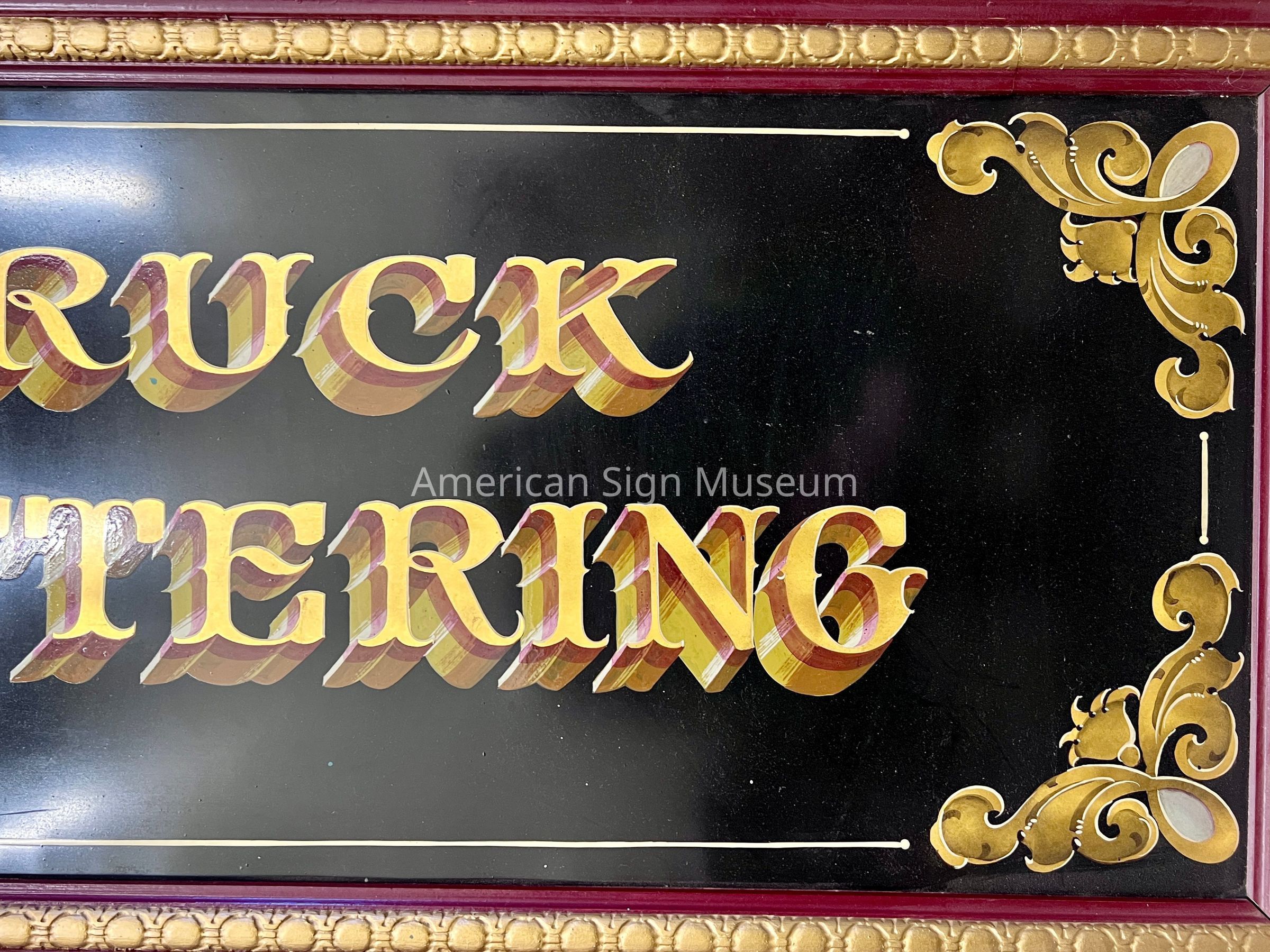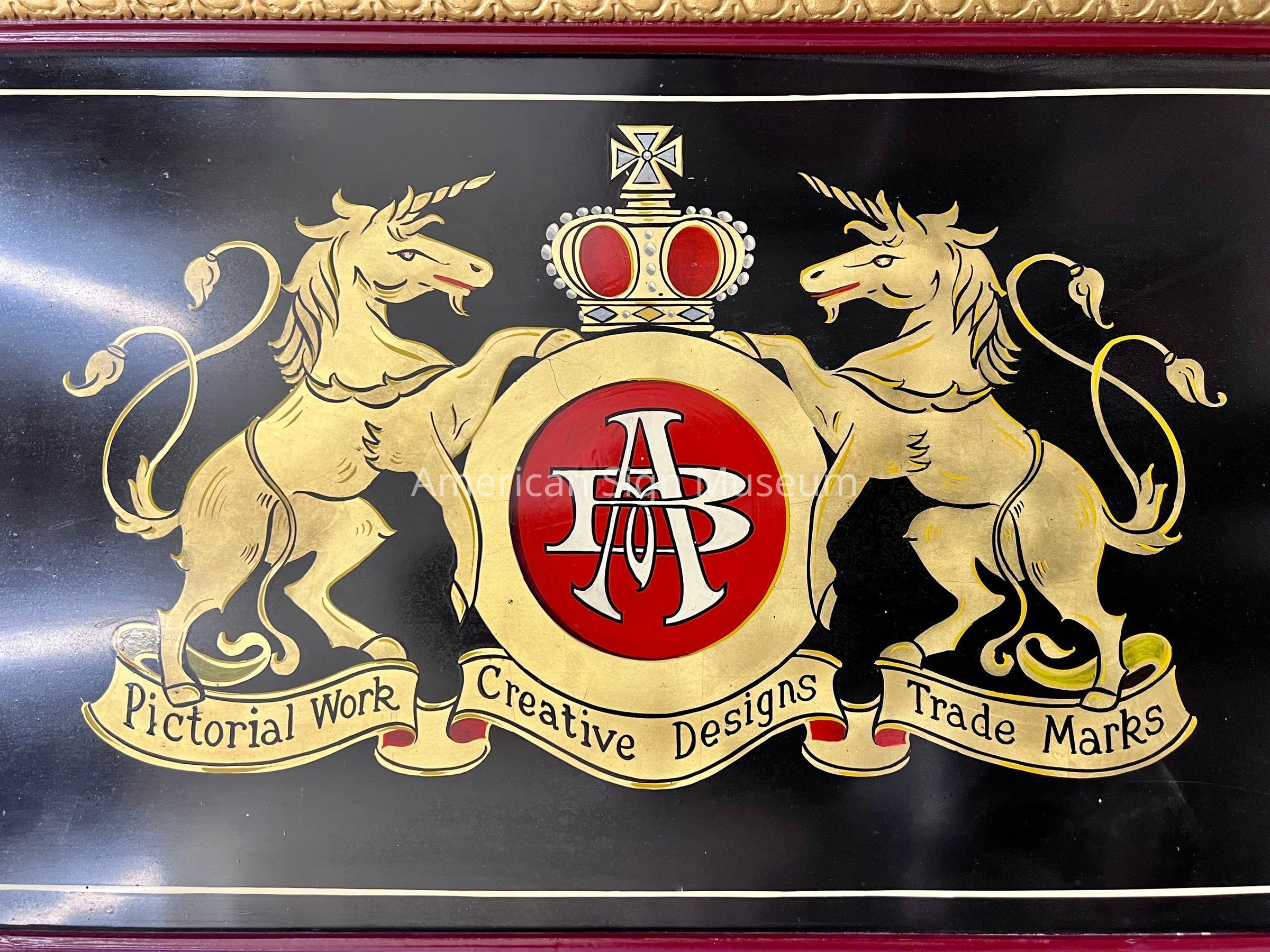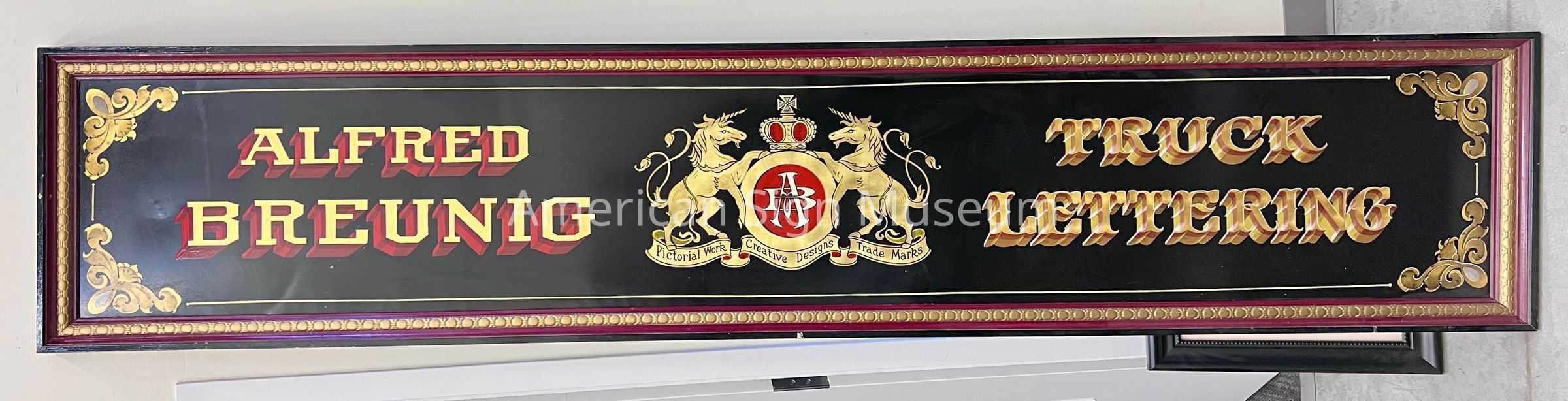 This is a painted tin sign bordered within a dark red and gold frame. The background of the sign is tin that is painted black, upon which fancy gold lettering, bordering and motifs are shown. At the center is a motif and logo of two unicorn-like animals, in gold, flanking a golden logo with the initials A through a B. The text reads, "Pictorial Work," Creative Designs," and "Trade Marks." To the left of the central motif is gold lettering with a drop-red shadow that reads, "Alfred Breunig," and to the right, more text that reads "Truck Lettering."Collection