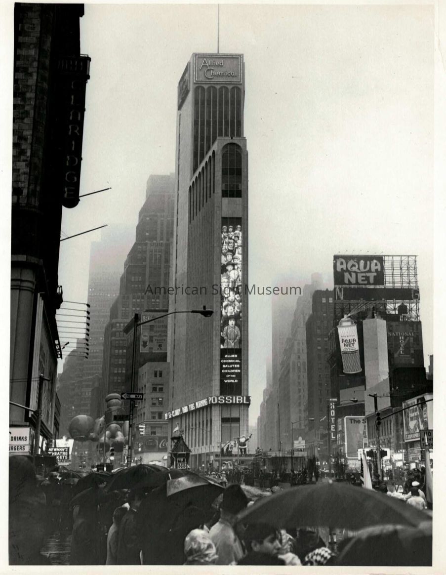 B&W photograph of Allied Chemical building "Allied Chemical Salutes Children of the World." Photo taken during Macy's Thanksgiving parade.