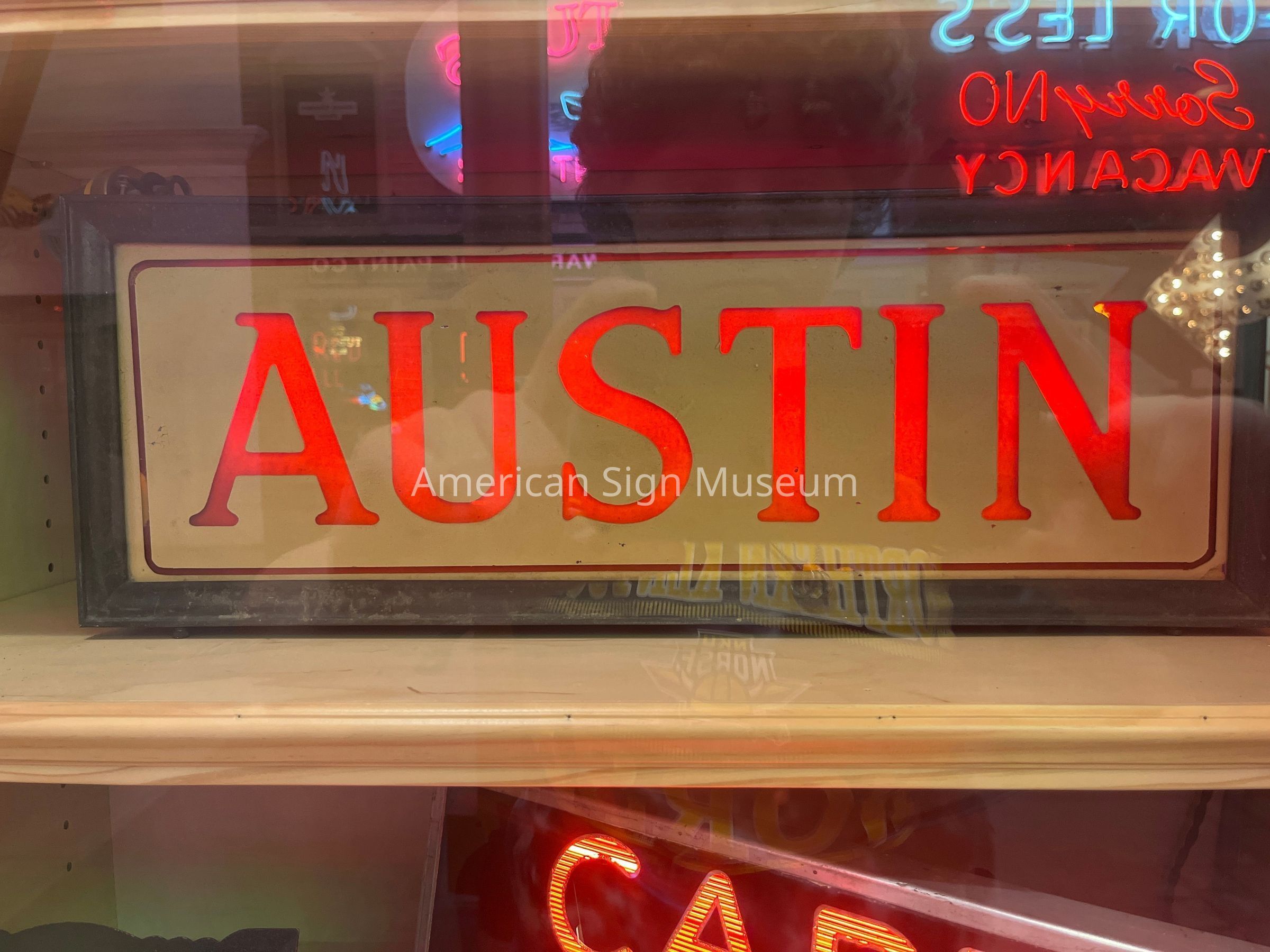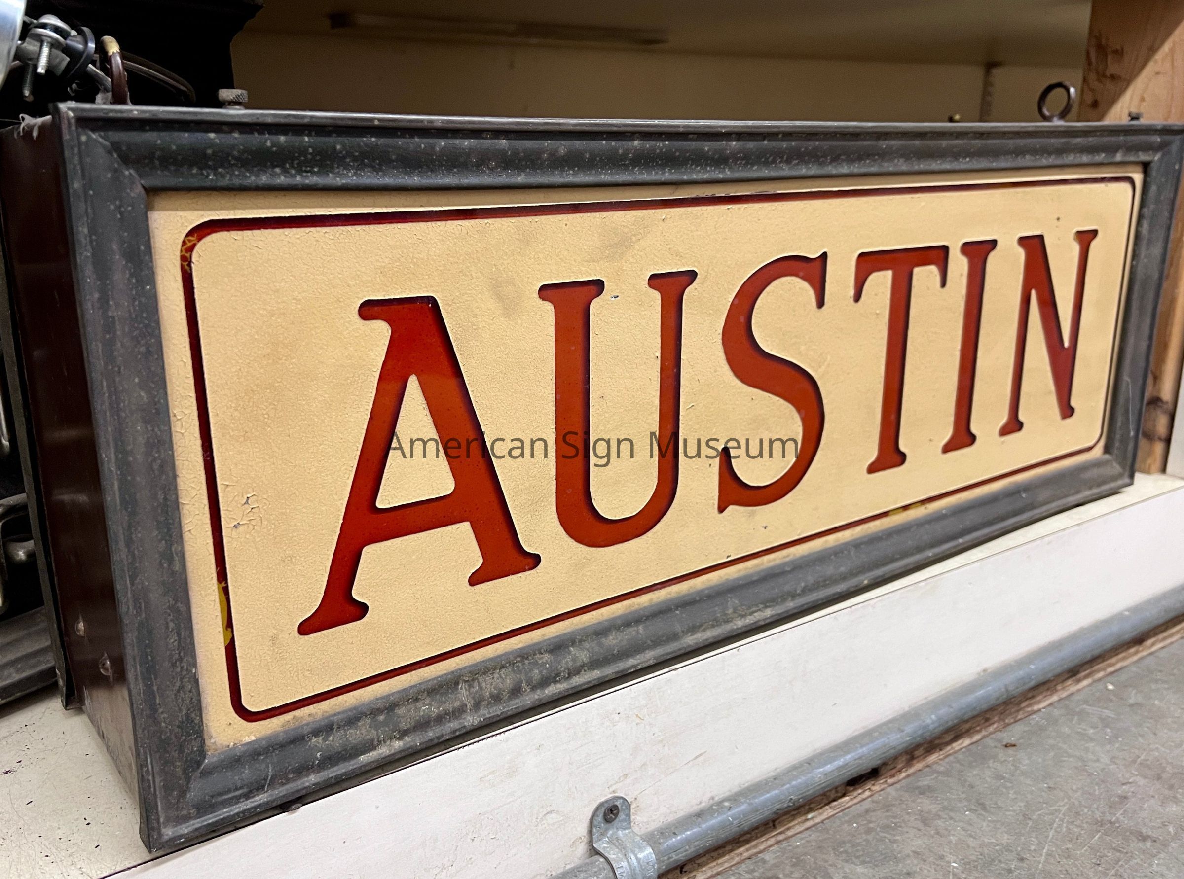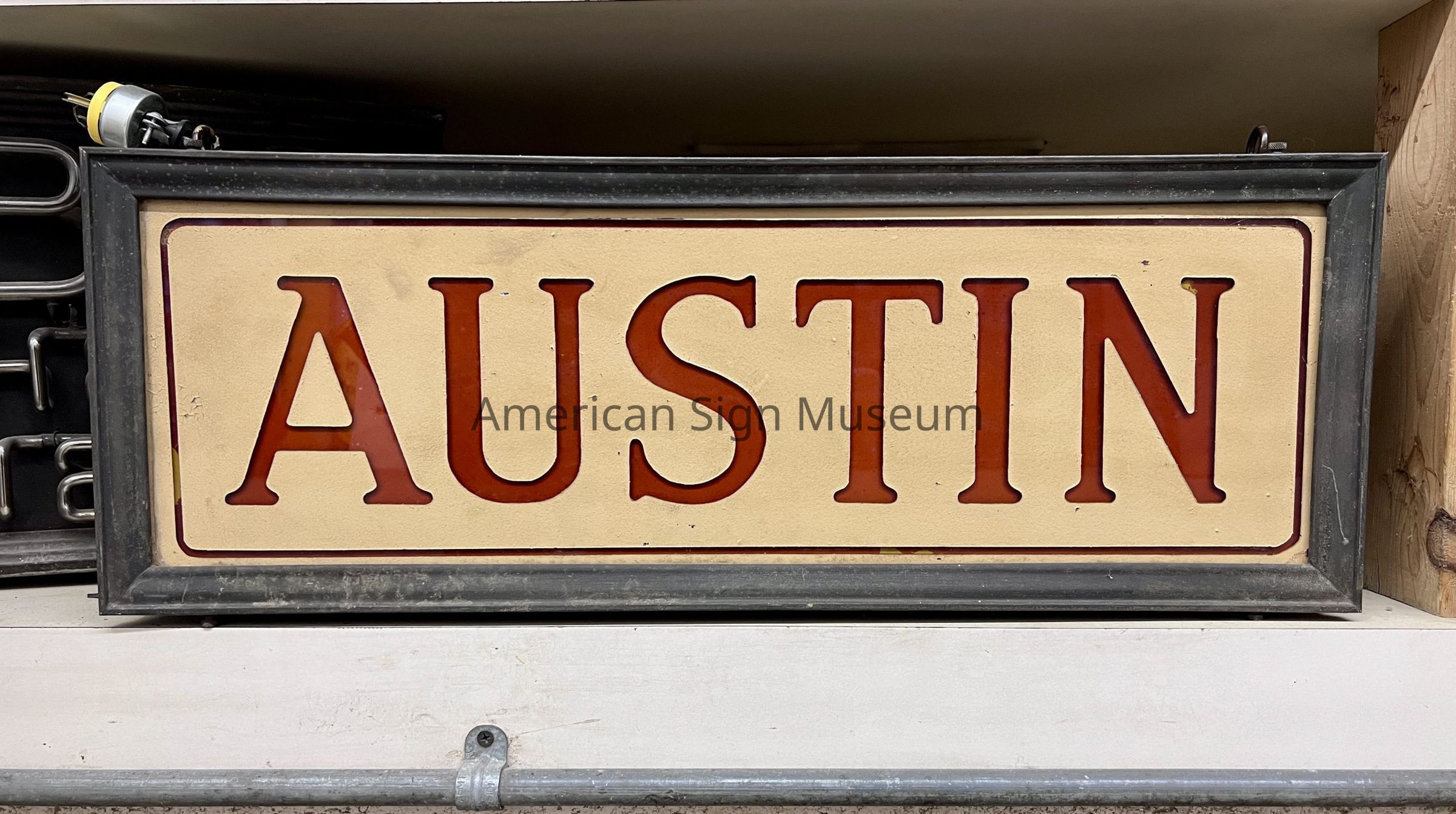Internally illuminated and made through the reverse glass technique, AUSTIN reads in red lettering on a beige background. The outer cabinet is made from metal.Collection