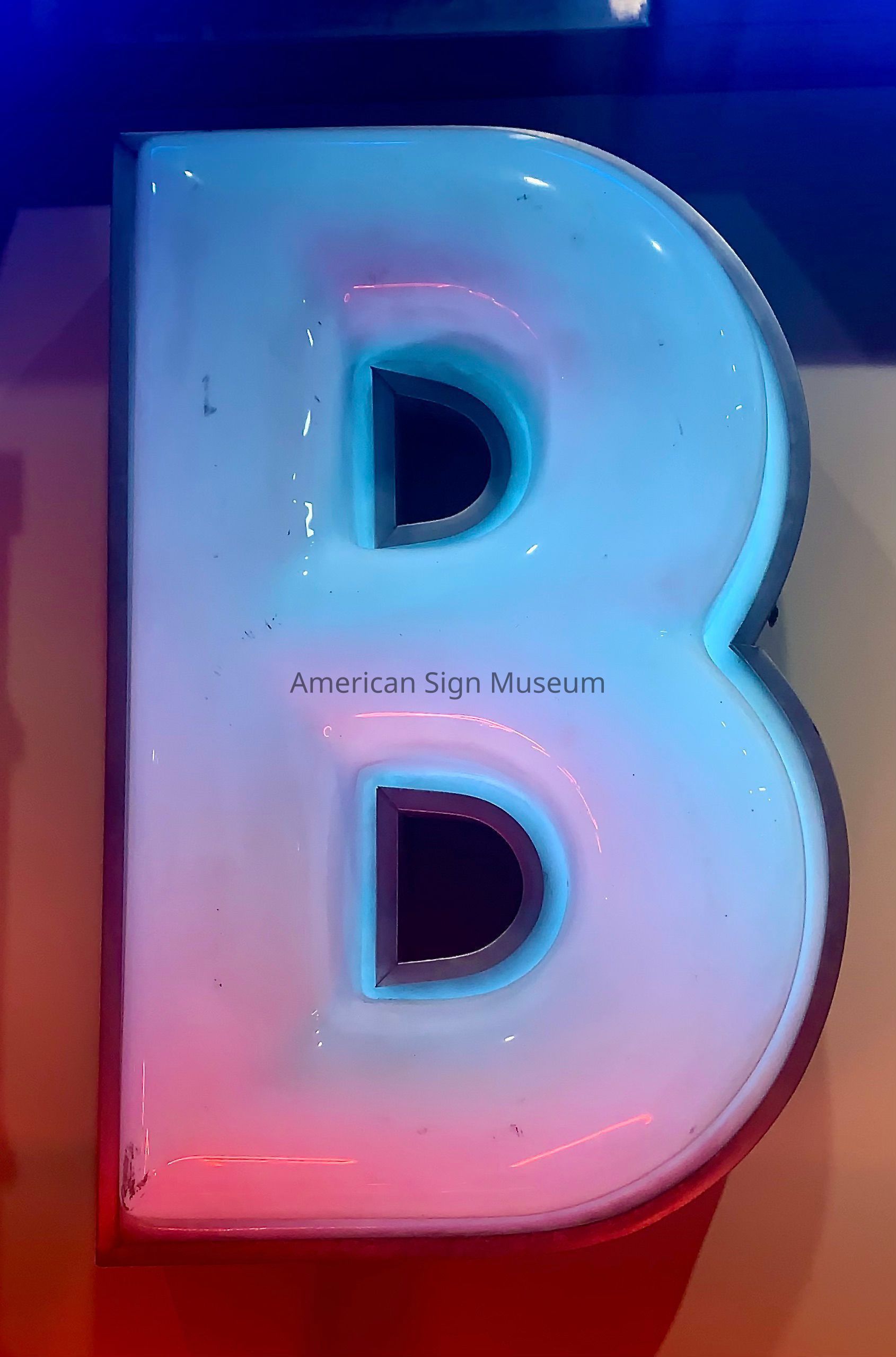 Embossed formed plastic "B" in aluminum channel mounted in aluminum channel frame. Letter originally had neon illumination.Collection