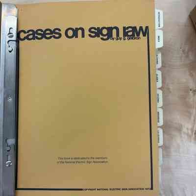Two volume set of Cases on SIgn Law by Guy G. Gelbron and published by National Electric Sign Association; 1975.Summaries of sign law cases are indexed by state: Alabama - New York in Volume 1 and the balance in Volume 2, with an additional section of "Federal" and "Canada."Collection
