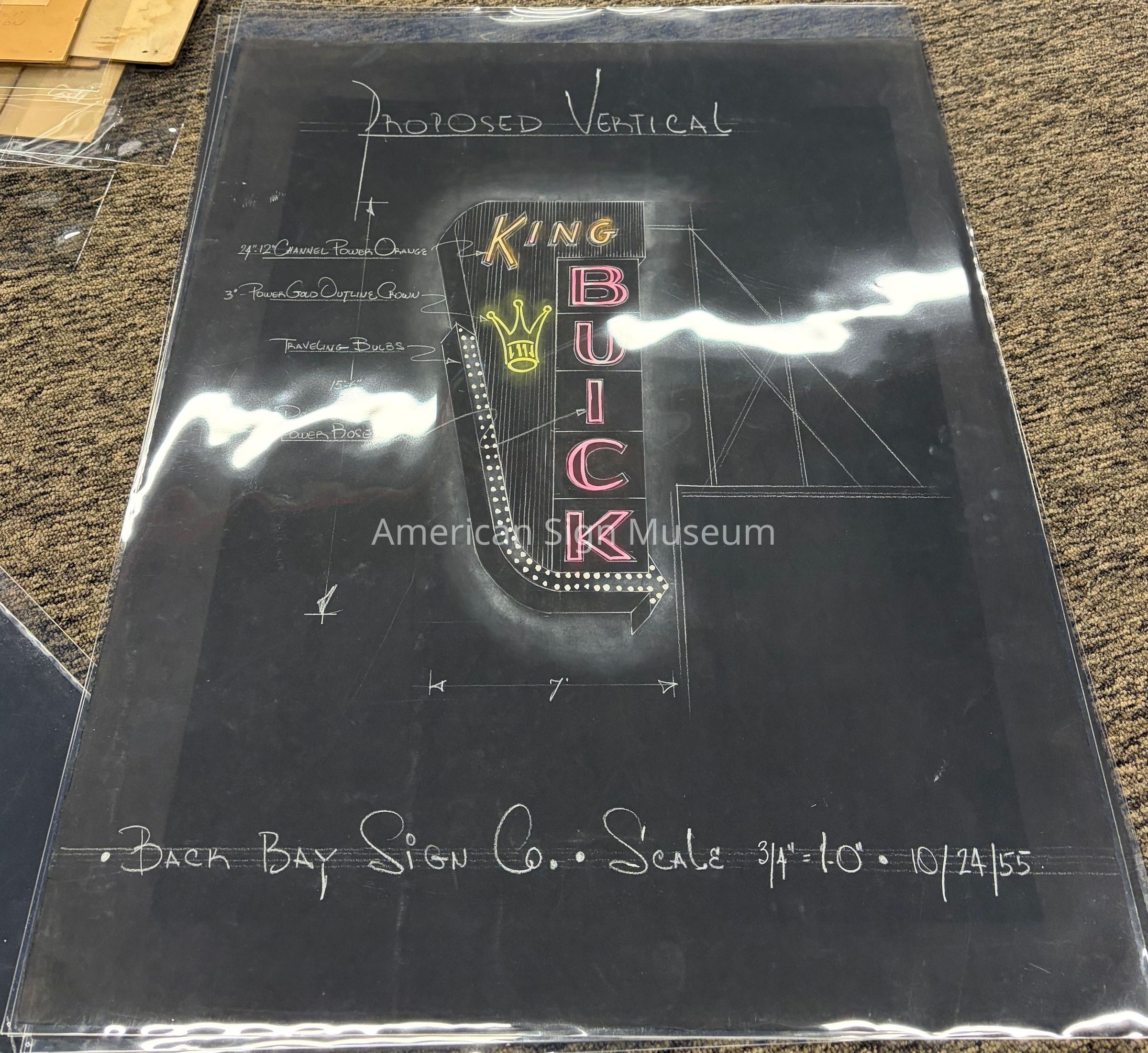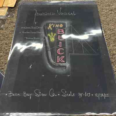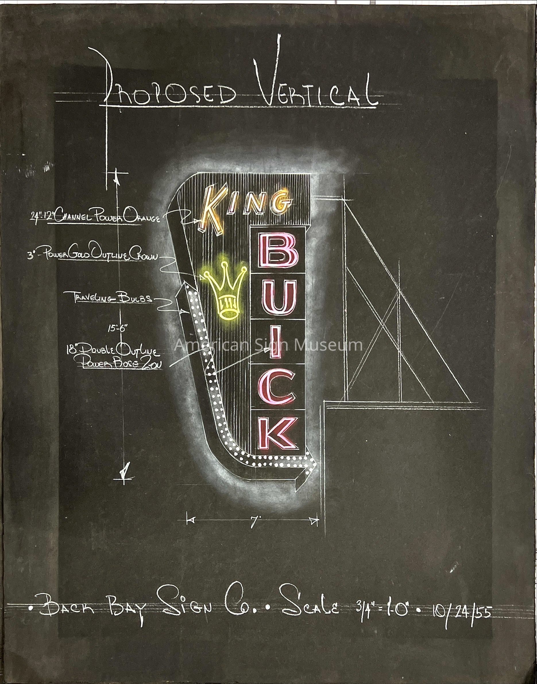 This specific sketch shows a “Proposed Vertical” design and was drawn on October 24, 1955. The sketch shows King and Buick Company names with orange and rose channel lettering raised letters. It also indicates neon, traveling bulbs and an animated crown icon.