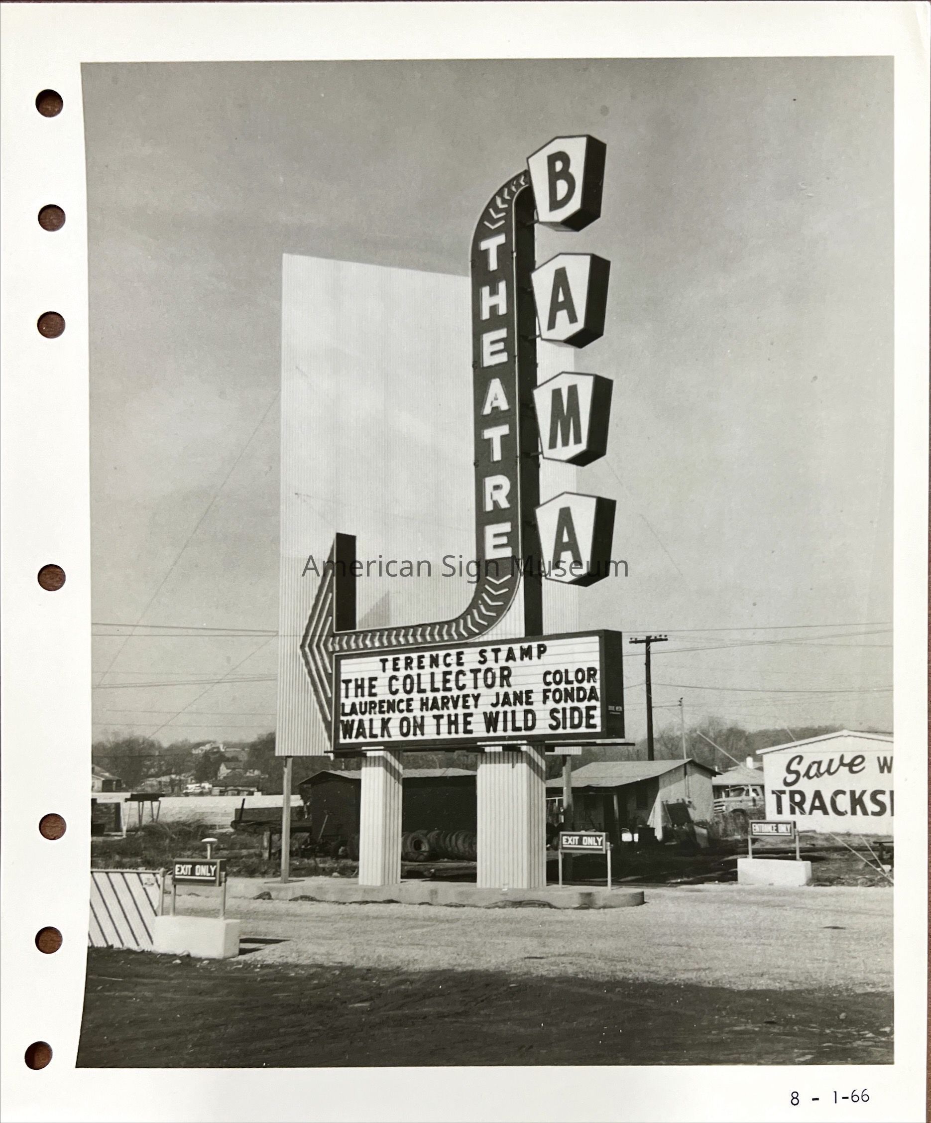 B&W photograph of neon theatre marquee - Bama Theatre Print reads 8-1-66.