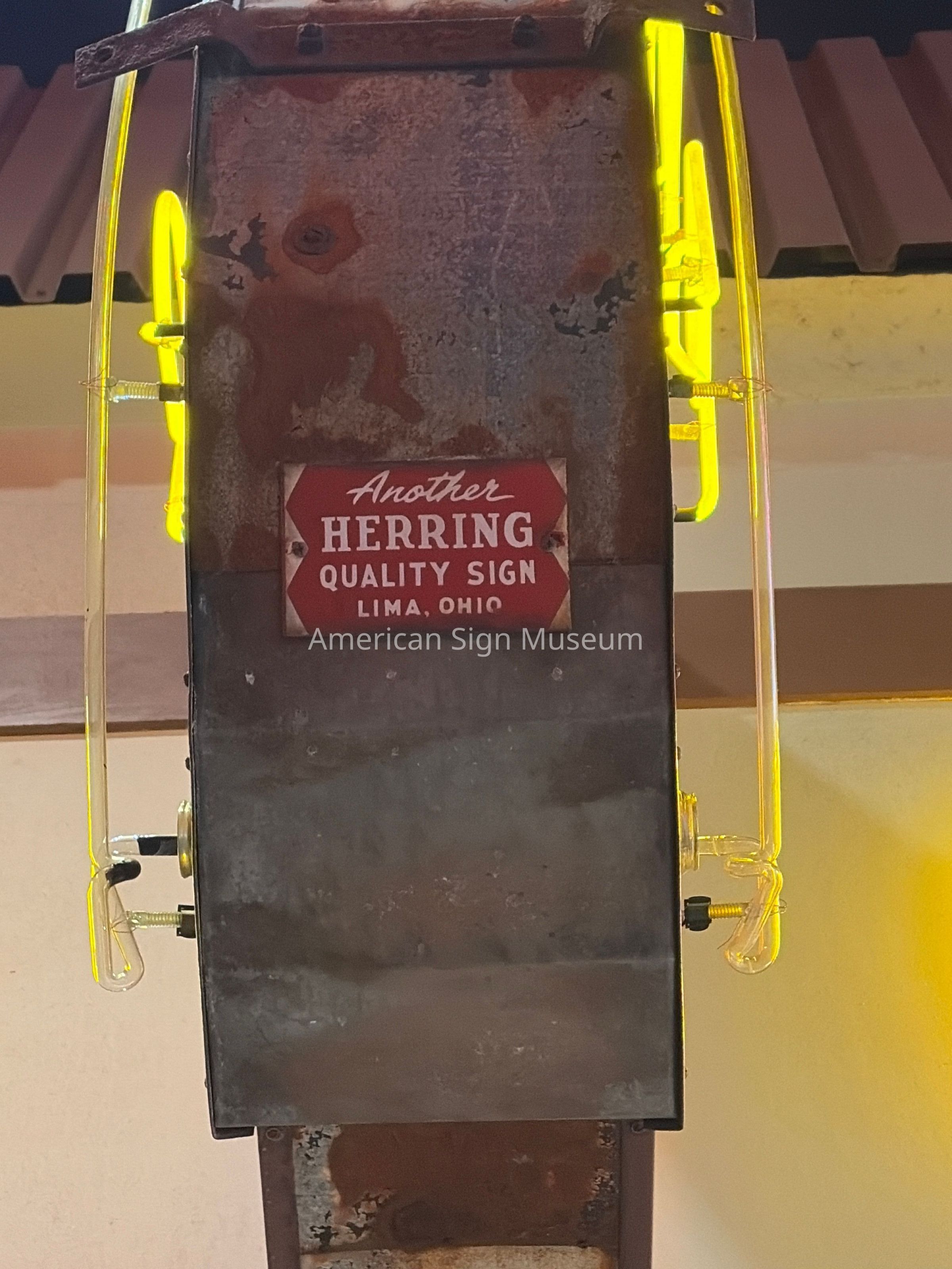 Double-faced porcelain enamel neon sign. It has a metal cabinet with porcelain enamel face.Collection
