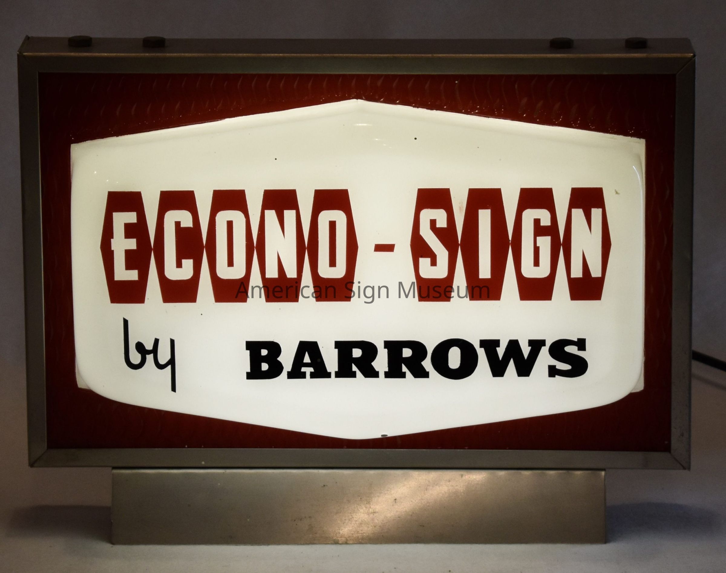 "Econo-Sign by Barrows" display is a salesman sample, presumably for larger on premise sign for Barrows Corp. Cincinnati, OH. Plastic pan face is reverse screen-printed and characterized by deep vacuum forming and textured background. Cabinet is aluminum extrusion of bent aluminum base. Internally illuminated.Collection