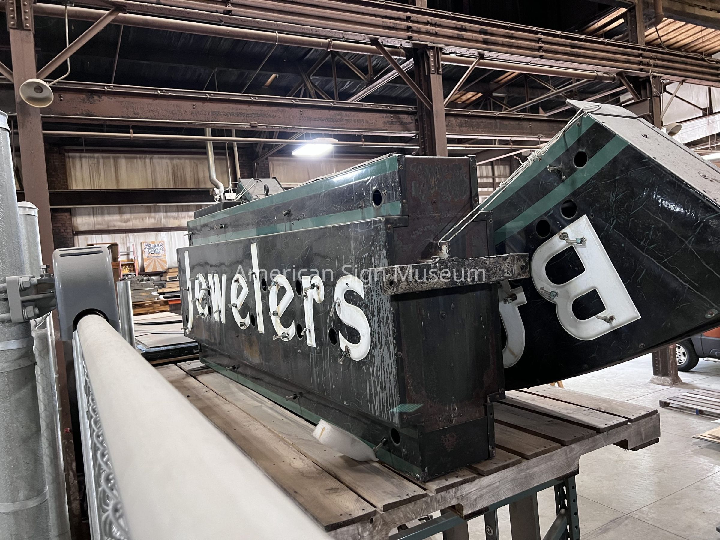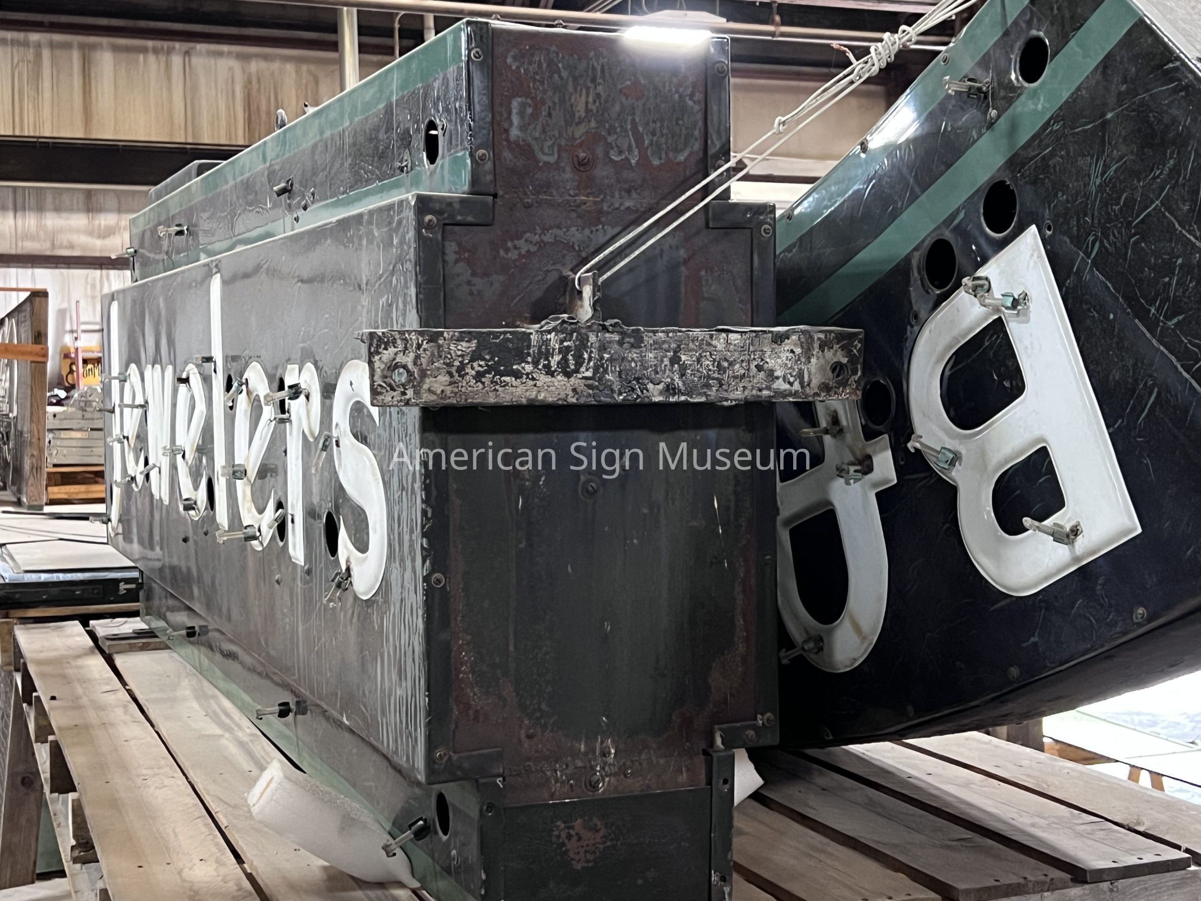 ASM’s 1930s Basinger Jewelers sign is comprised of two halves of metal, porcelain enamel and neon lettering. It was manufactured by Artkraft Sign company, also founded in Lima, by leading sign-maker dubbed "the lamplighter of Broadway", Jacob Starr when he left his NYC employer, Strauss Signs, in the 1920s. After a successful first few years, Starr eventually merged his new Artkraft company with his former employer Strauss in 1931, creating the Artkraft Strauss Sign Company. The Lima location remained although the business was headquartered in NYC. By the 1950s, Artkraft Strauss was a goliath outdoor advertiser, responsible for the “smoking” Camel cigarette ads and the flying Anheuser-Busch eagle. Additionally, the company initiated the Times Square New Year’s Eve ball-drop tradition in 1907. Today, the company still maintains billboards, and provides advertising consulting for architects, designers, historians and outdoor advertising companies.Collection