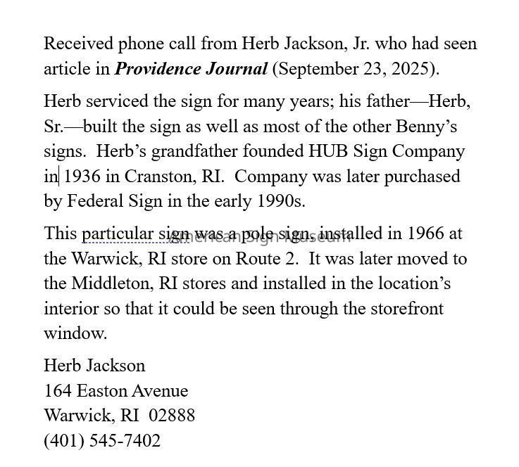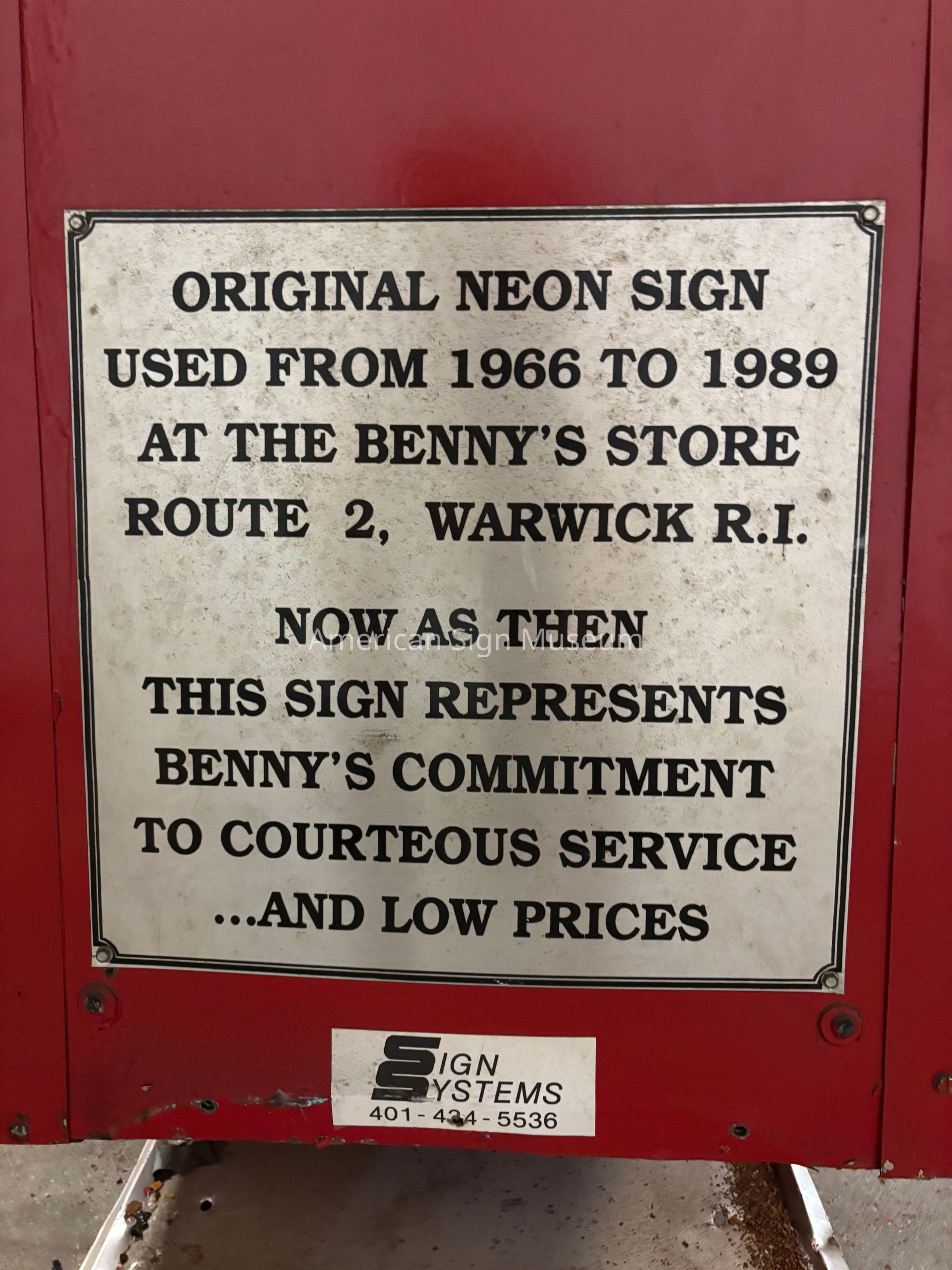 Original neon sign used from 1966 to 1989 at the Benny's store Route 2, Warwick R.I. Now as then this sign represents Benny's commitment to courteous service... and low pricesMaterial/Technique