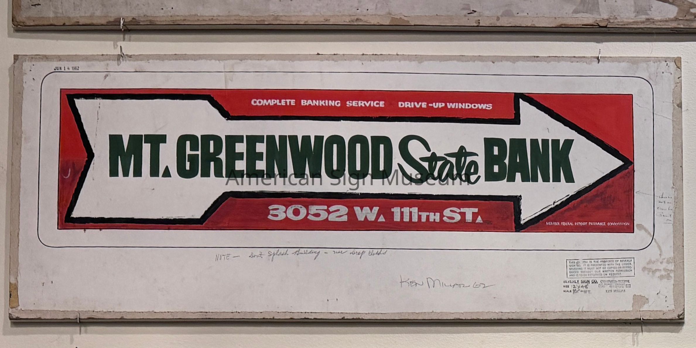 A sketch for a sign that reads, "Mt. Greenwood State Bank." It features a white arrow with text outlined in black. The arrow is on a red block background. We may believe that this sketch was intended for a final sign at a location at 3052 W. 111th. Street.