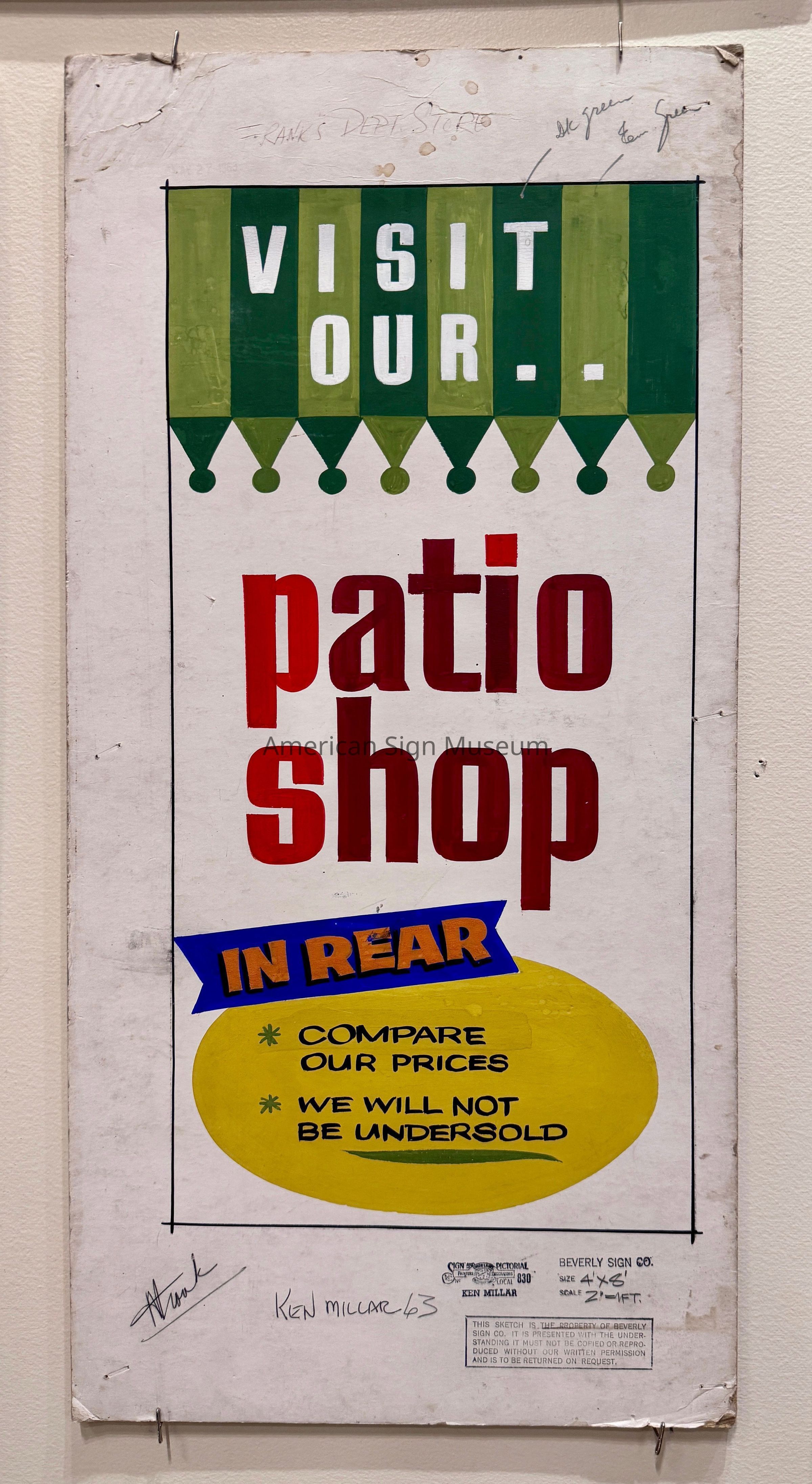 A sketch for a sign that reads, "Visit our Patio Shop," with other advertising language. The central text is set within a rectangle that is filled with green fence-like shapes in the upper part, a blue text ribbon and a yellow circular field of text. It is signed by Ken Millar, a well-known sign painter who worked for Beverly Sign Co., and stamped with the Beverly Sign Co. name. It also has what is presumably the eventual location for the final sign: Frank's Dept. Store.