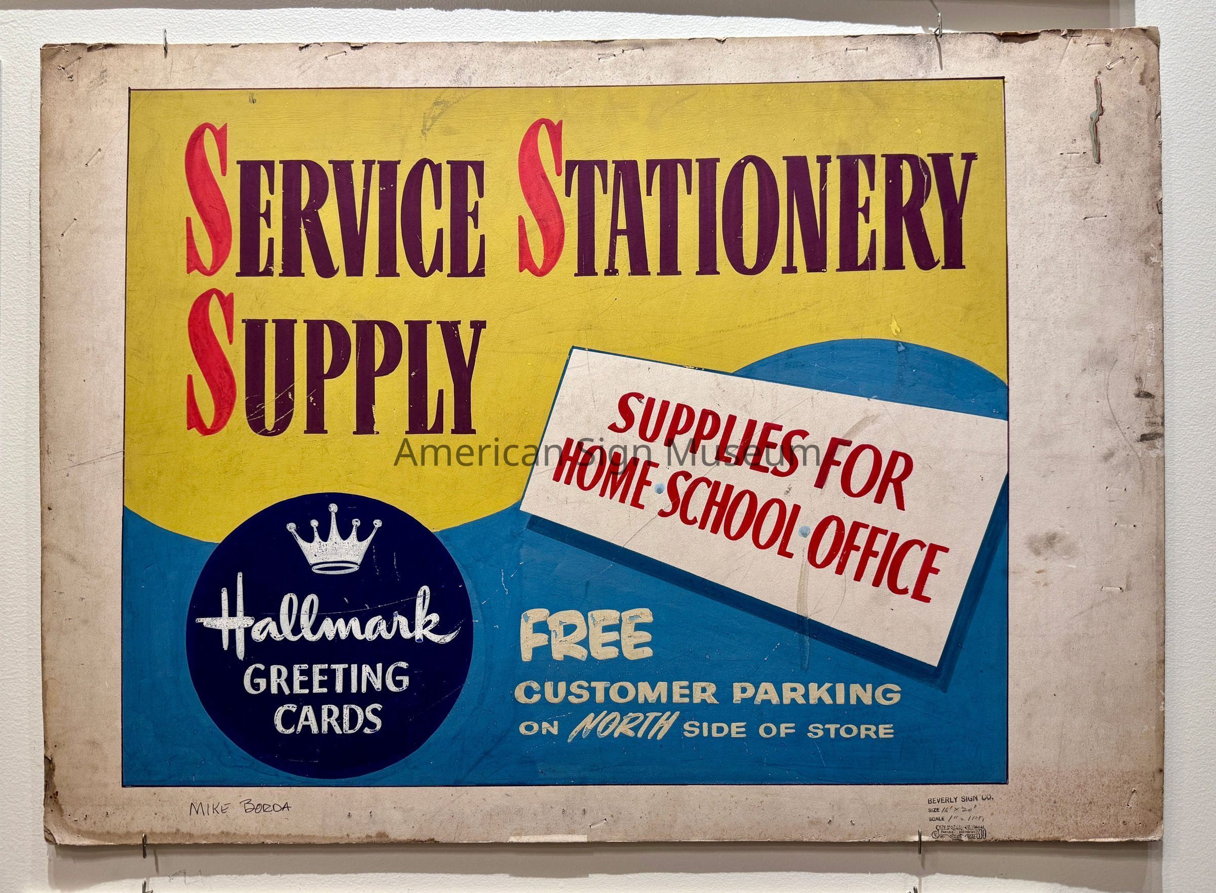 A sketch for a sign that reads, "Service Stationery Supply" on a yellow background. The bottom half has a blue background, a hallmark logo, and more text. It is signed by Mike Borda and is stamped with the Beverly Sign Co. name.