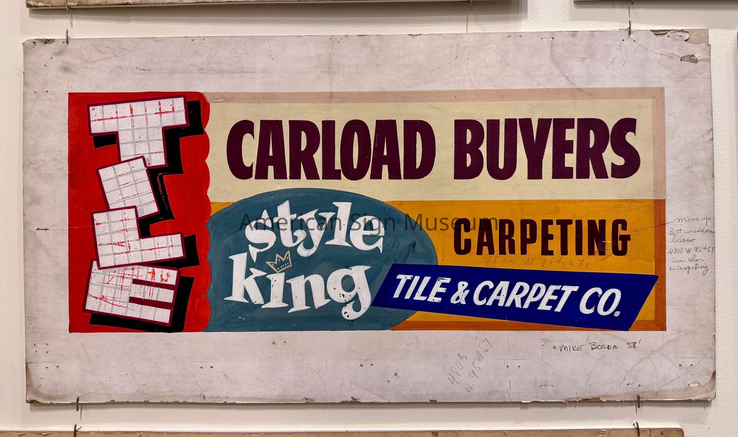 A sketch for a sign that reads, "Style King Carpeting," with other advertising phrases. It features red, yellow and blue shapes with a variety of font styles. It is signed by Mike Borda and has what is presumably the eventual location for the final sign: 4803 W 95th St. Handwritten with graphite on the far-right hand appears to be a comment/feedback, "move up letter address below, same color as carpeting"