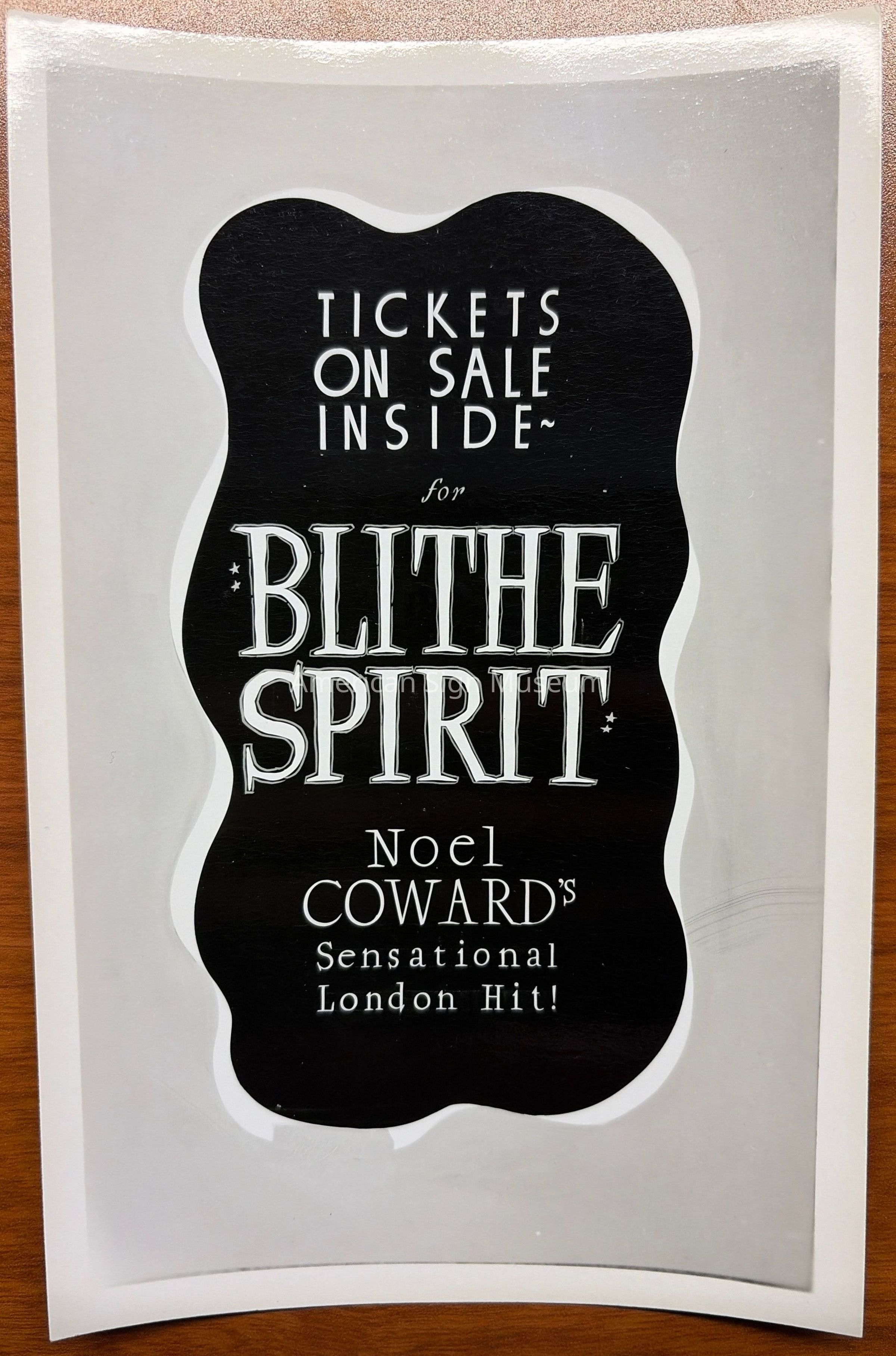 Black and white photograph of a show card reading "Tickets on Sale Inside for Blithe Spirit Noel Coward Sensational London Hit!" Made by Don Sturdivant.Collection