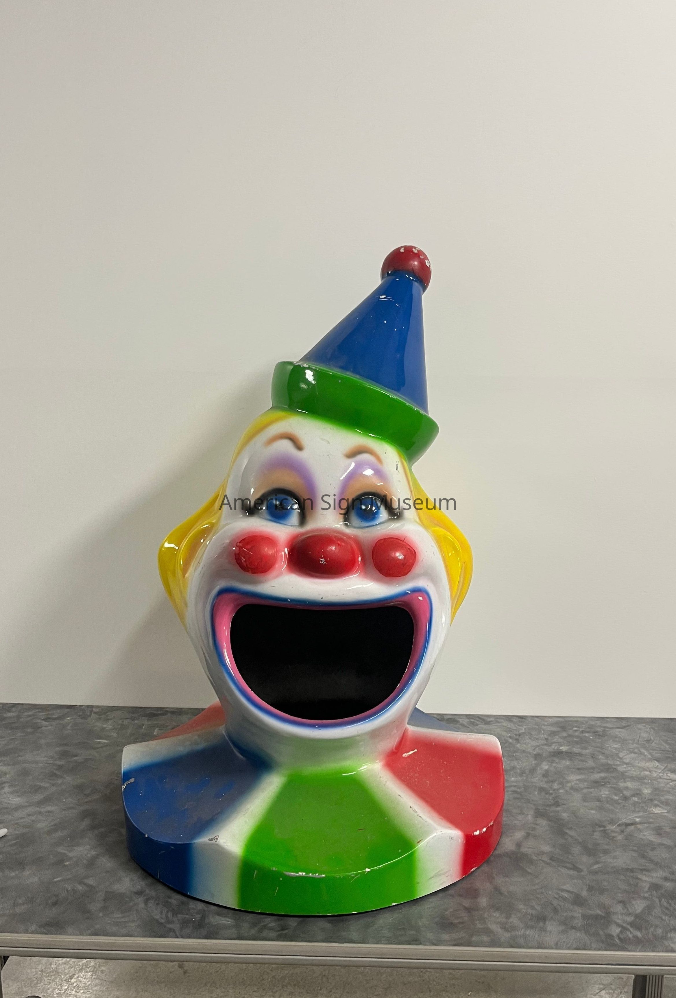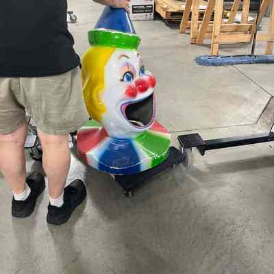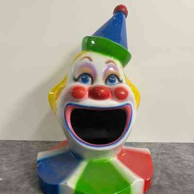 Garbage can lid shaped to look like a clown