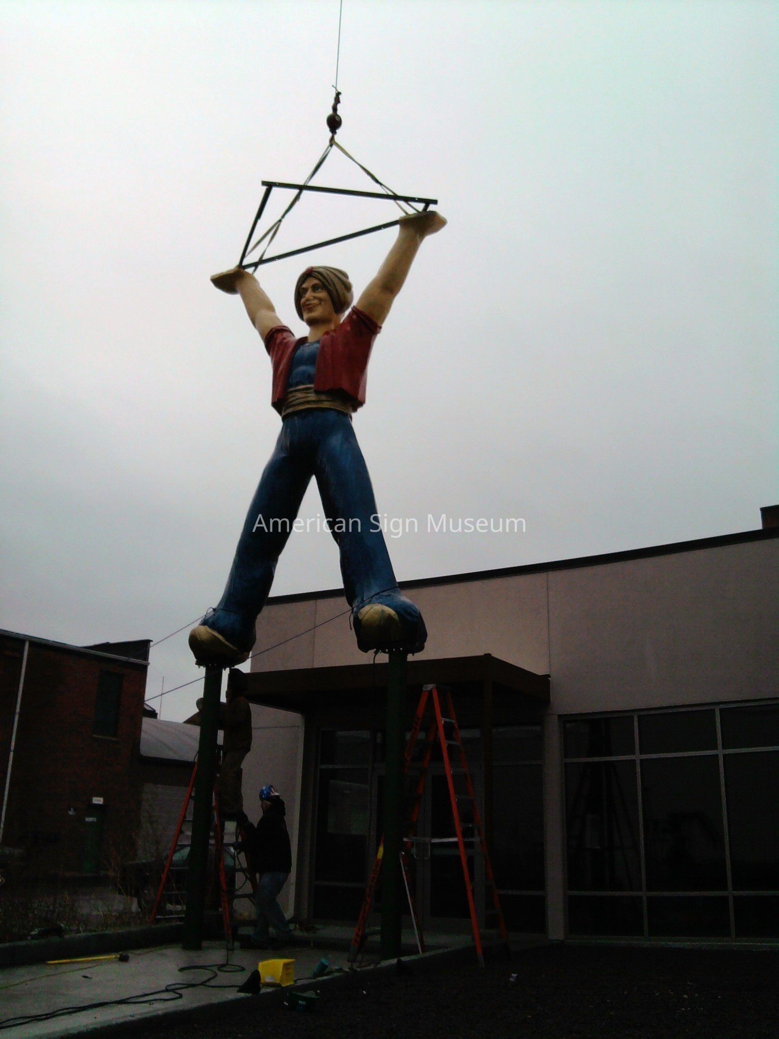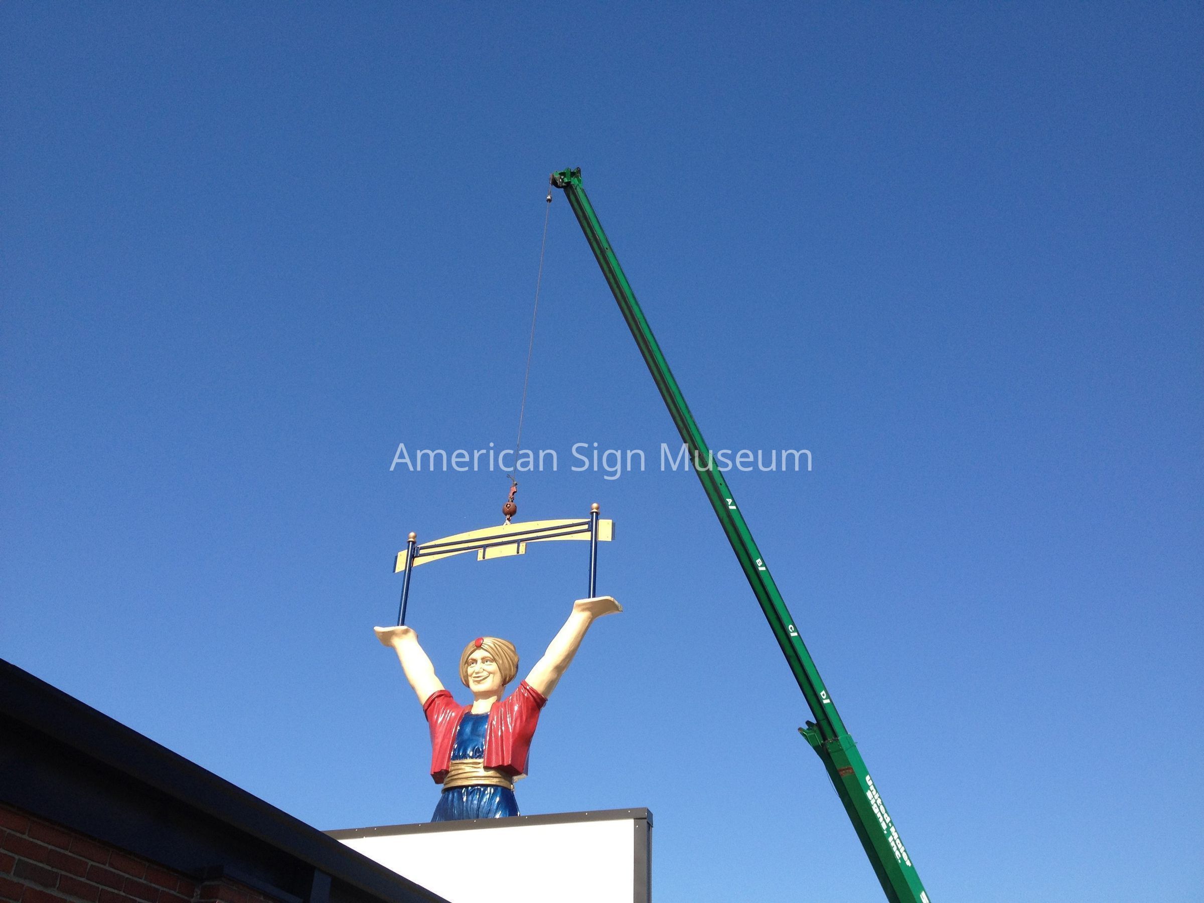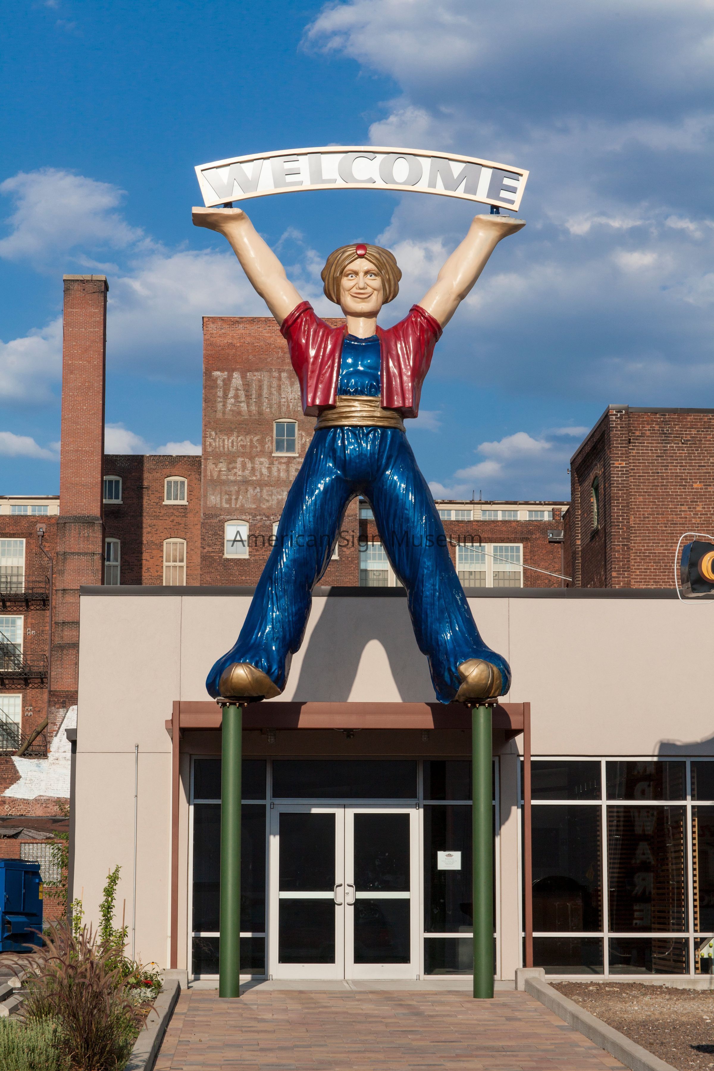 This 21 foot tall, fiberglass genie that now welcomes visitors to the Museum once served as a mascot for Carpeteria, a West Coast flooring company. Having two faces, one on each side of his head, allowed the genie to greet customers from whichever way they were traveling. The Museum acquired the genie in 2003. It was restored and the Museum added the Welcome banner thanks to the former United-Maier Signs that was based here in Cincinnati.Collection