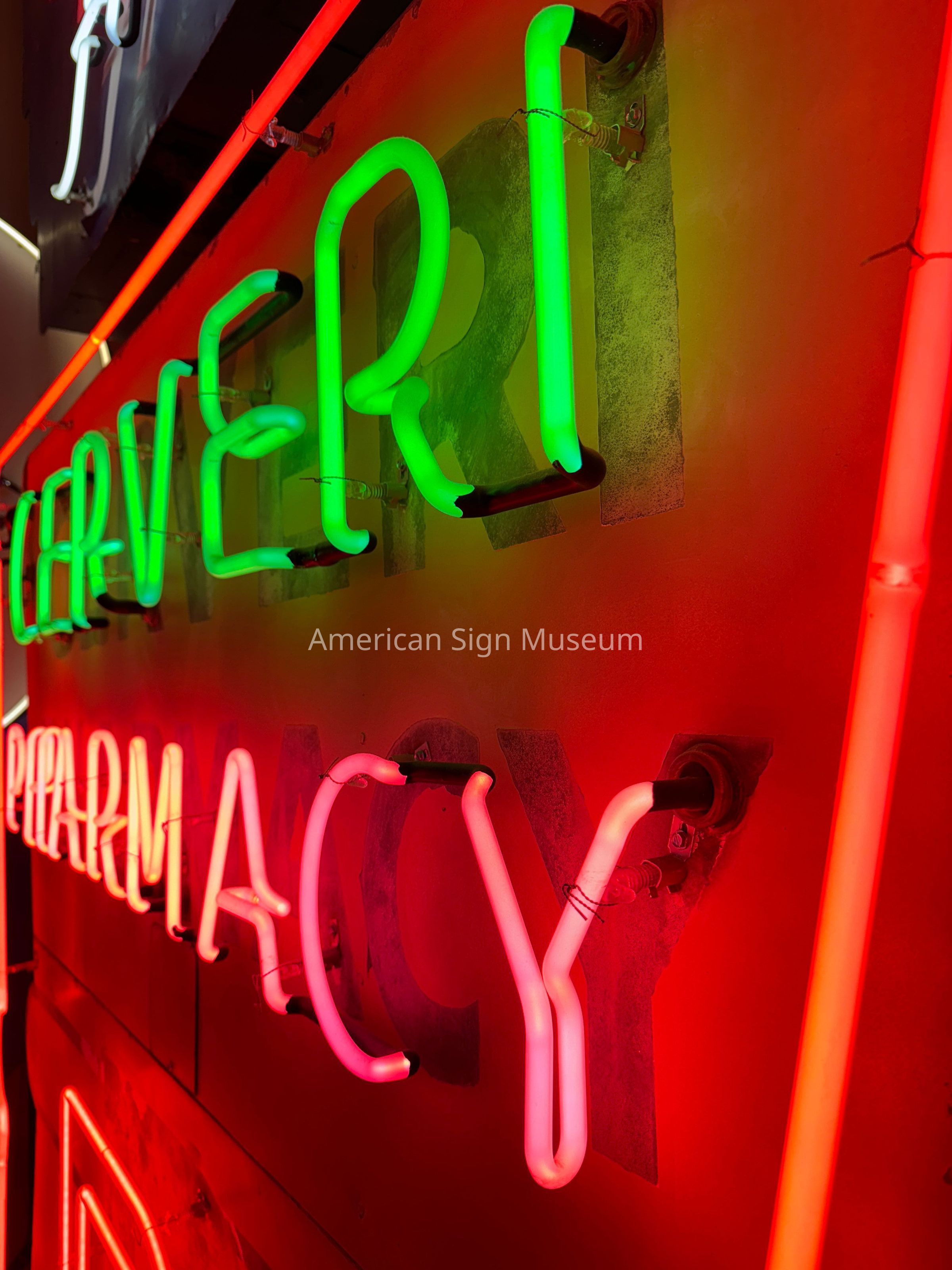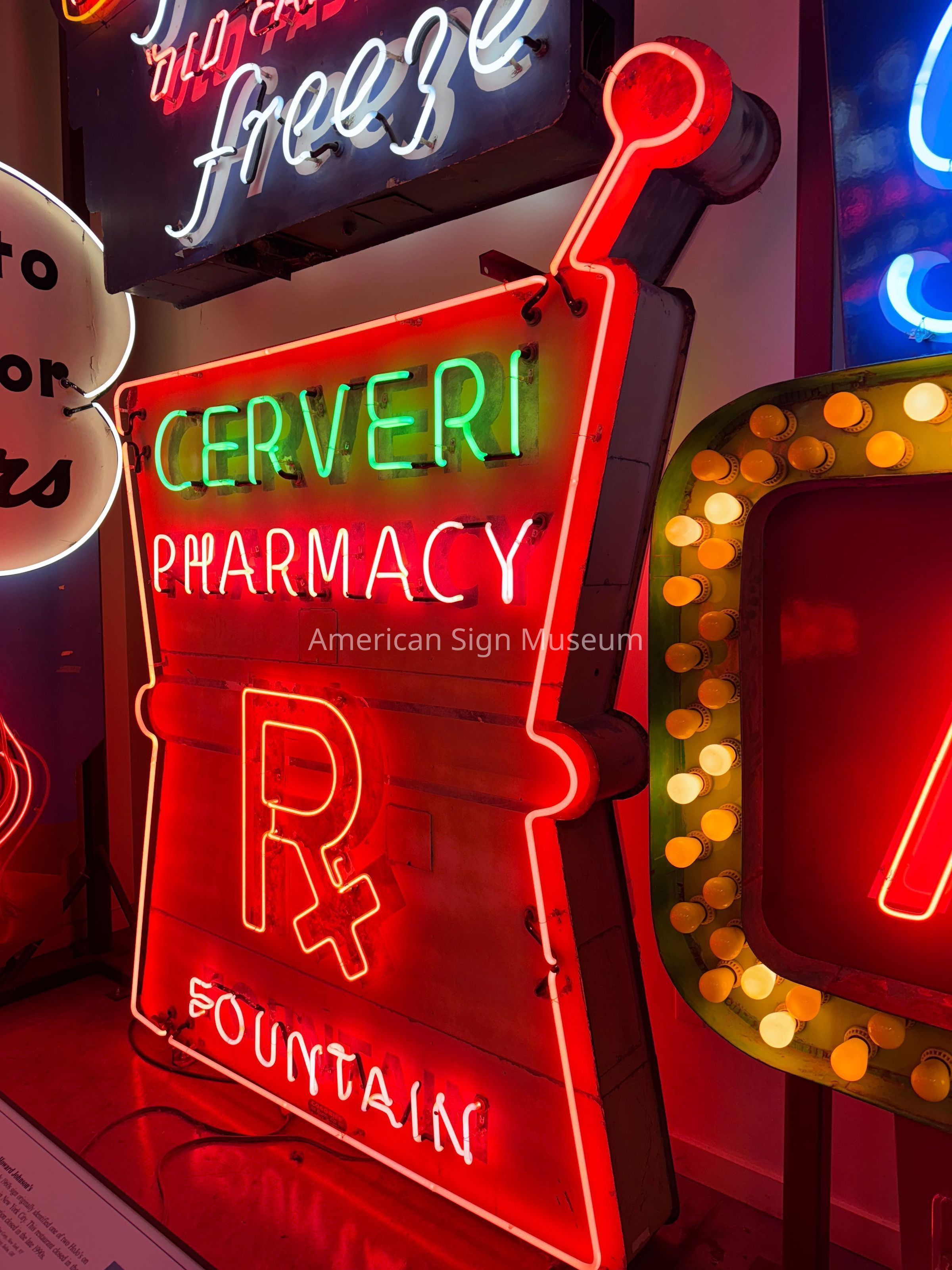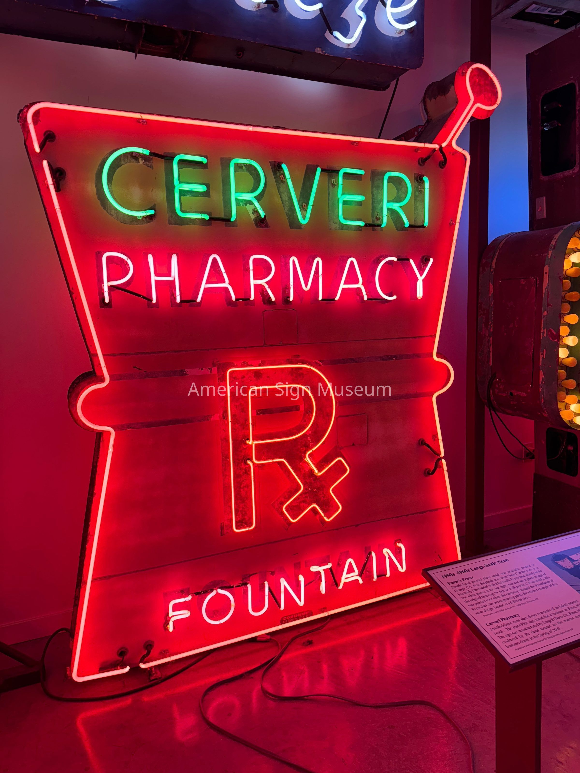 Doubled-faced neon sign shows remnants of its baked enamel finish. The mid-1950s sign identified a pharmacy business in Reno, NV. The sign was manufactured by Cosgriff Neon Co., Reno, NV, as evidenced by the decal located on the bottom center. After 52 years in business, Cerveri closed in the Spring of 2000, at which time it was the last surviving mom-and-pop drugstore in downtown Reno.Collection