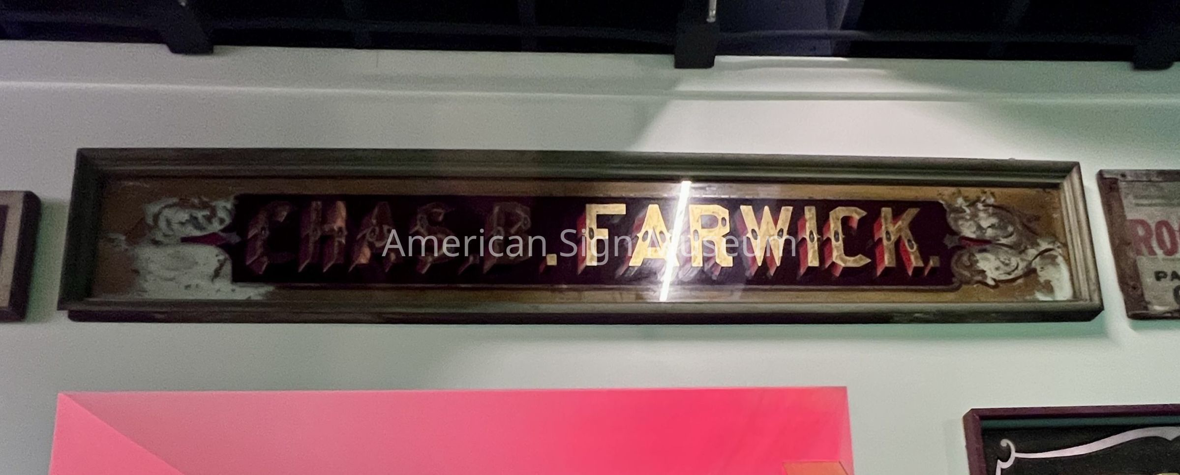 Made from heavy glass, this sign is reverse painted and has gold-leaf. It reads, "Chas B. Farwick," and includes a fancy gold border with two far-left and far-right motifs. It is enclosed inside of a wooden border.