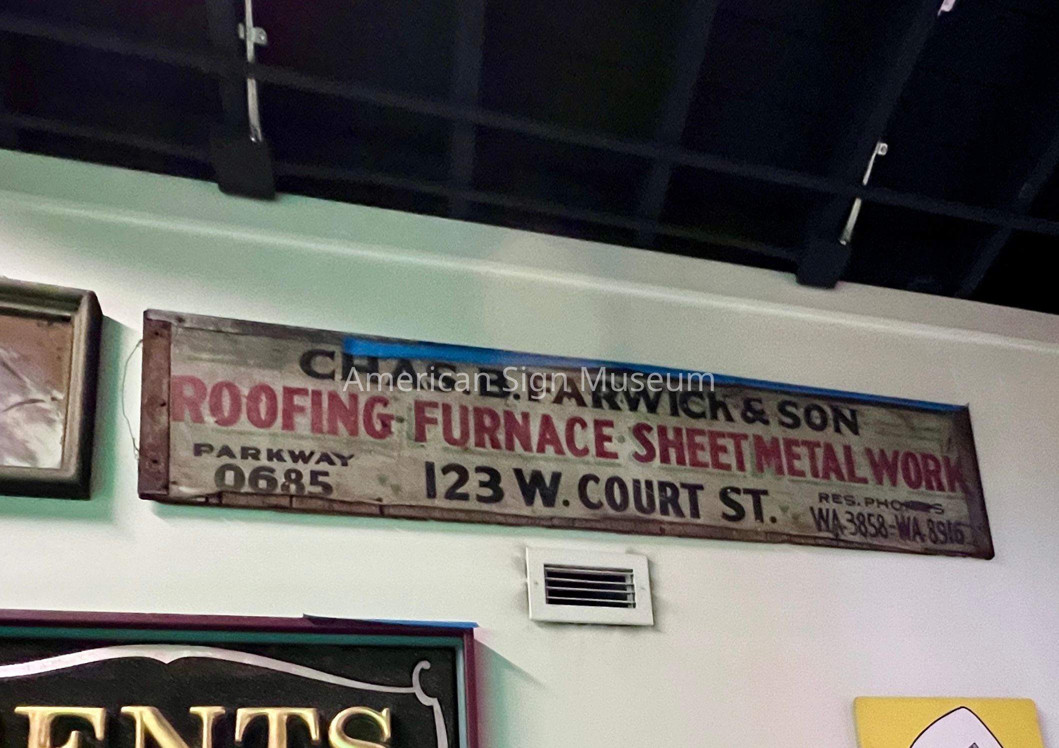 This is a hand-made and hand-painted wooden sign that was once installed on the side of a truck. It reads, "Chas. B. Farwick & Son," "Roofing Furnace Sheetmetal Work," "Parkway 0685," "123 W. Court Street," and, "Res. Phones WA 3858 - WA 8916"