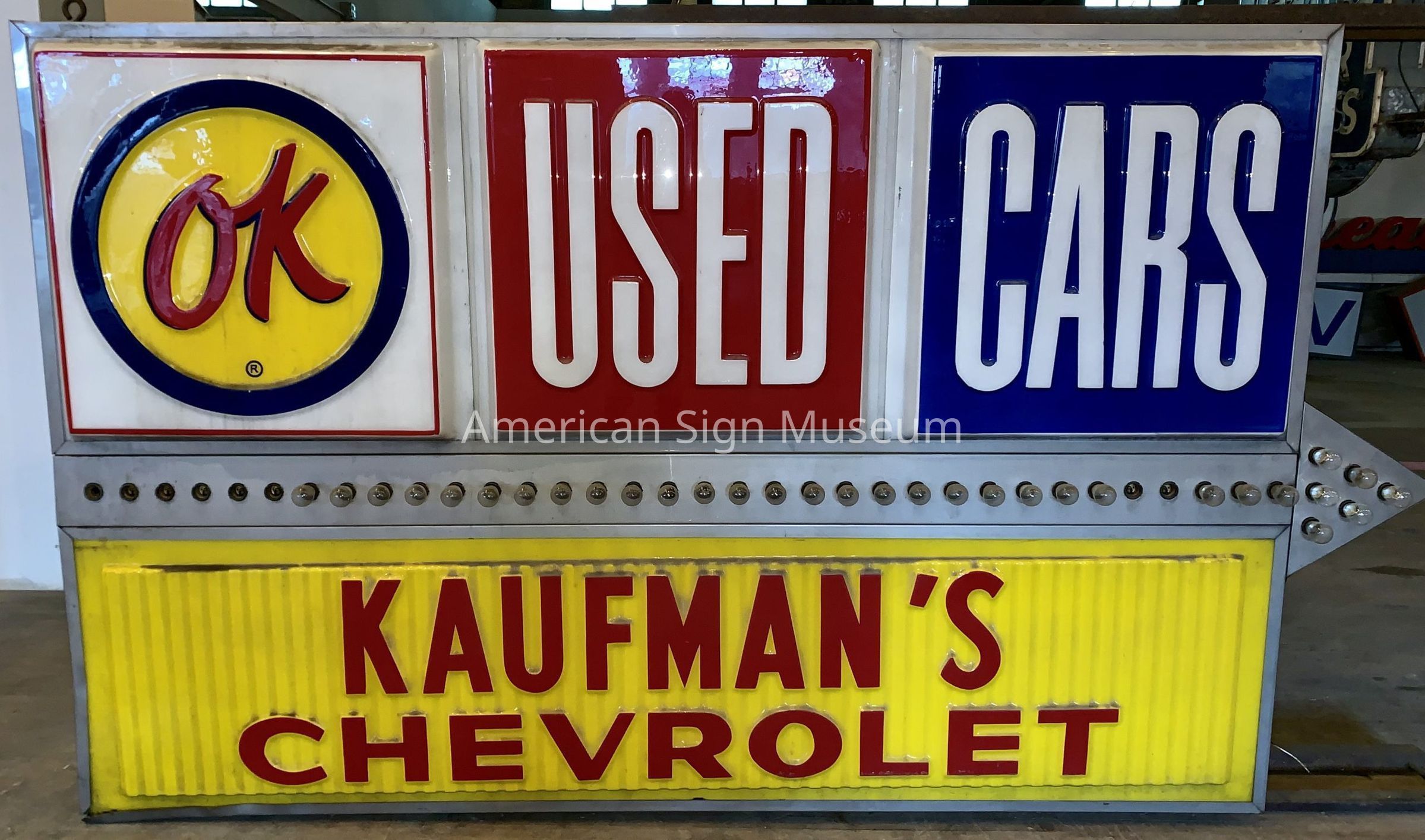 Double-faced internally illuminated plastic pan faced sign has chasing lightbulb arrow. The Chevrolet “OK” used car logo became almost as recognizable as the Chevrolet Bow Tie brand mark. The “OK” concept started during the 1920s as a quality check program, and eventually grew into a guarantee plan that attracted customers for many years.Collection