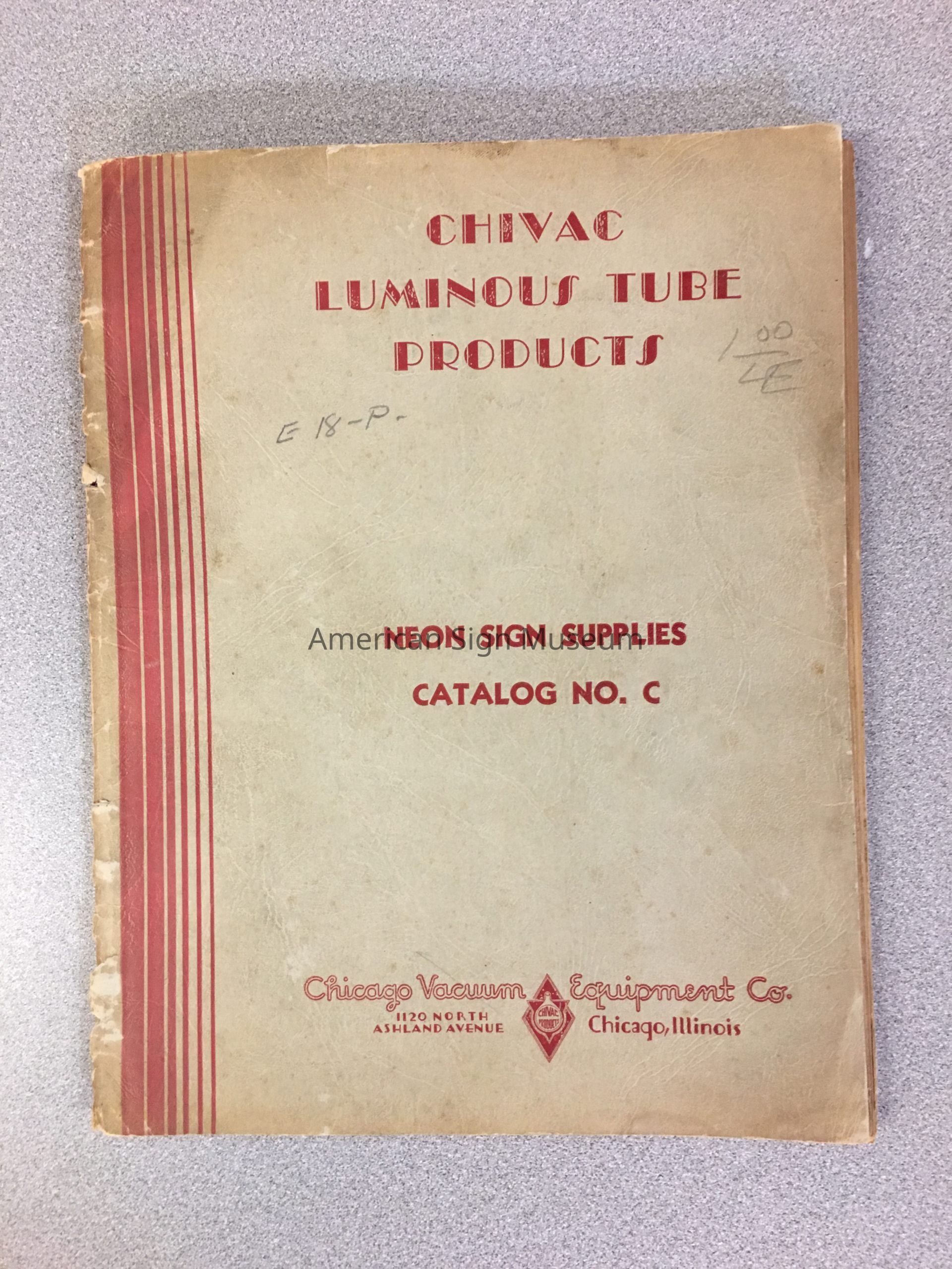 "Chivac Luminous Tube Products" catalog from Chicago Vacuum Equipment Company. 85 pages in Cerlux binding.Collection
