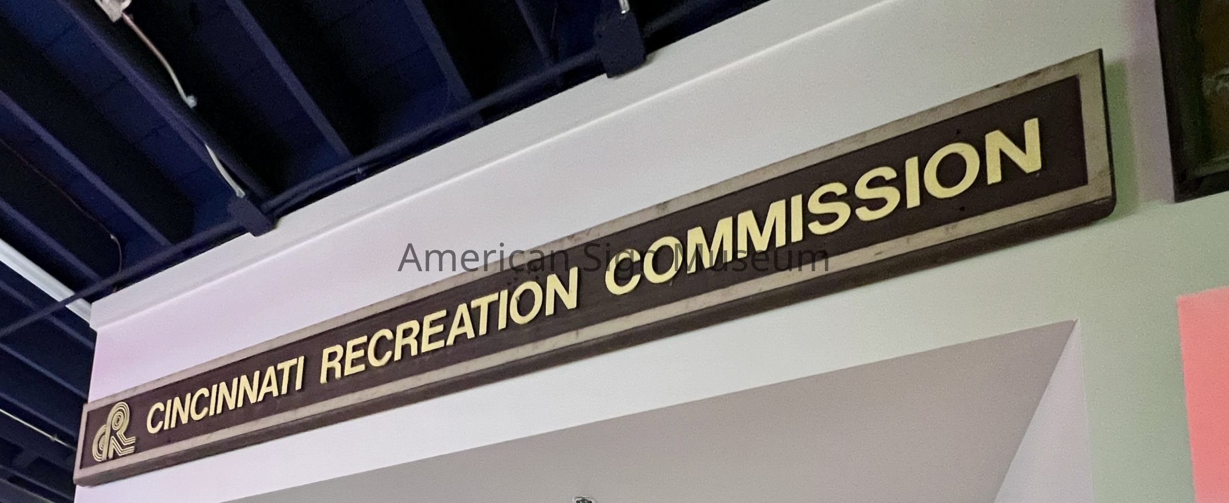 Sandblasted wooden sign that says "Cincinnati Recreation Commission"