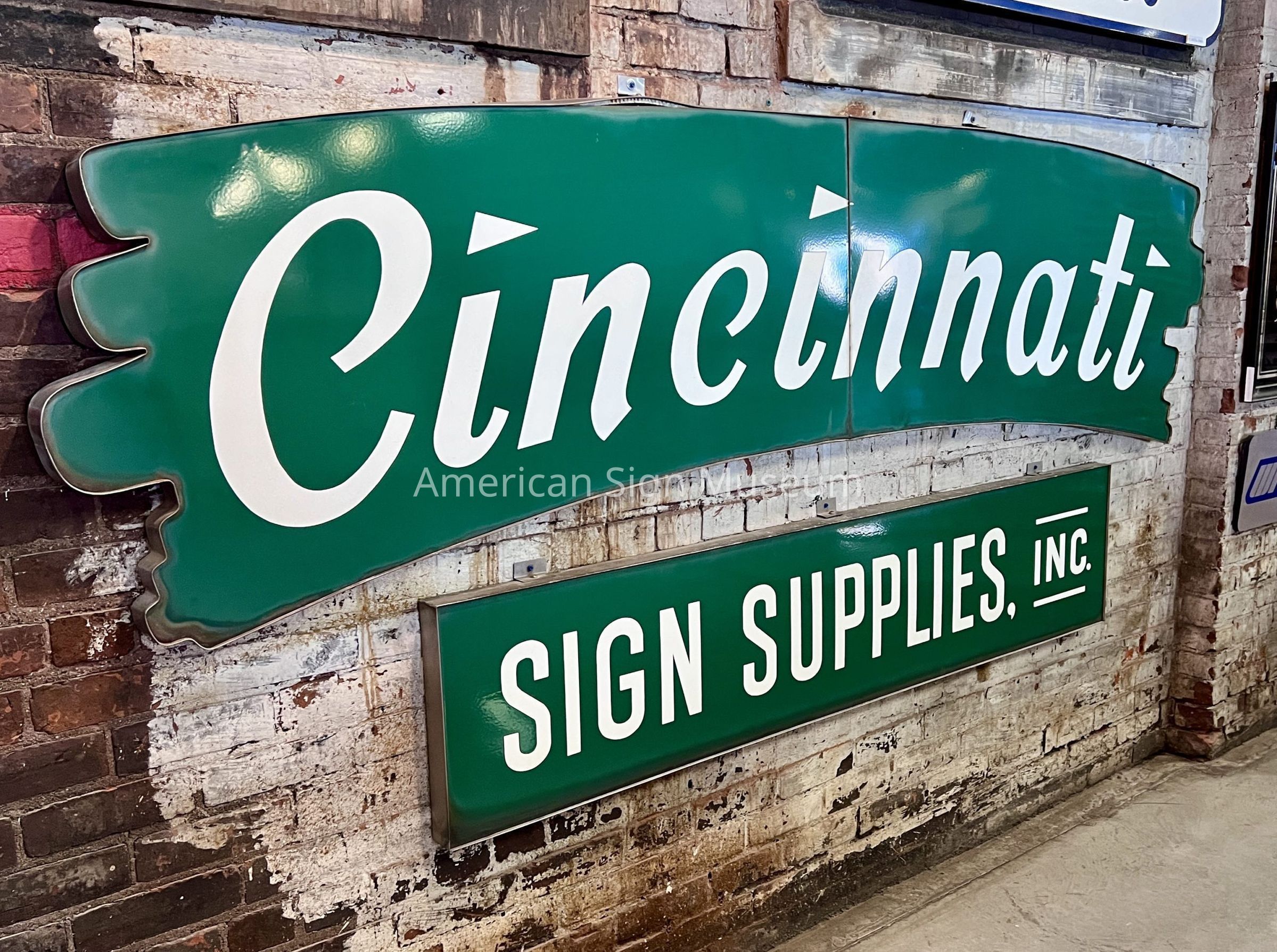 The sign itself is in two parts; the top section says Cincinnati with the lower section showing Sign Supplies, Inc, all in white type. Both sign faces are green porcelain enamel and outlined by a metal border.Collection