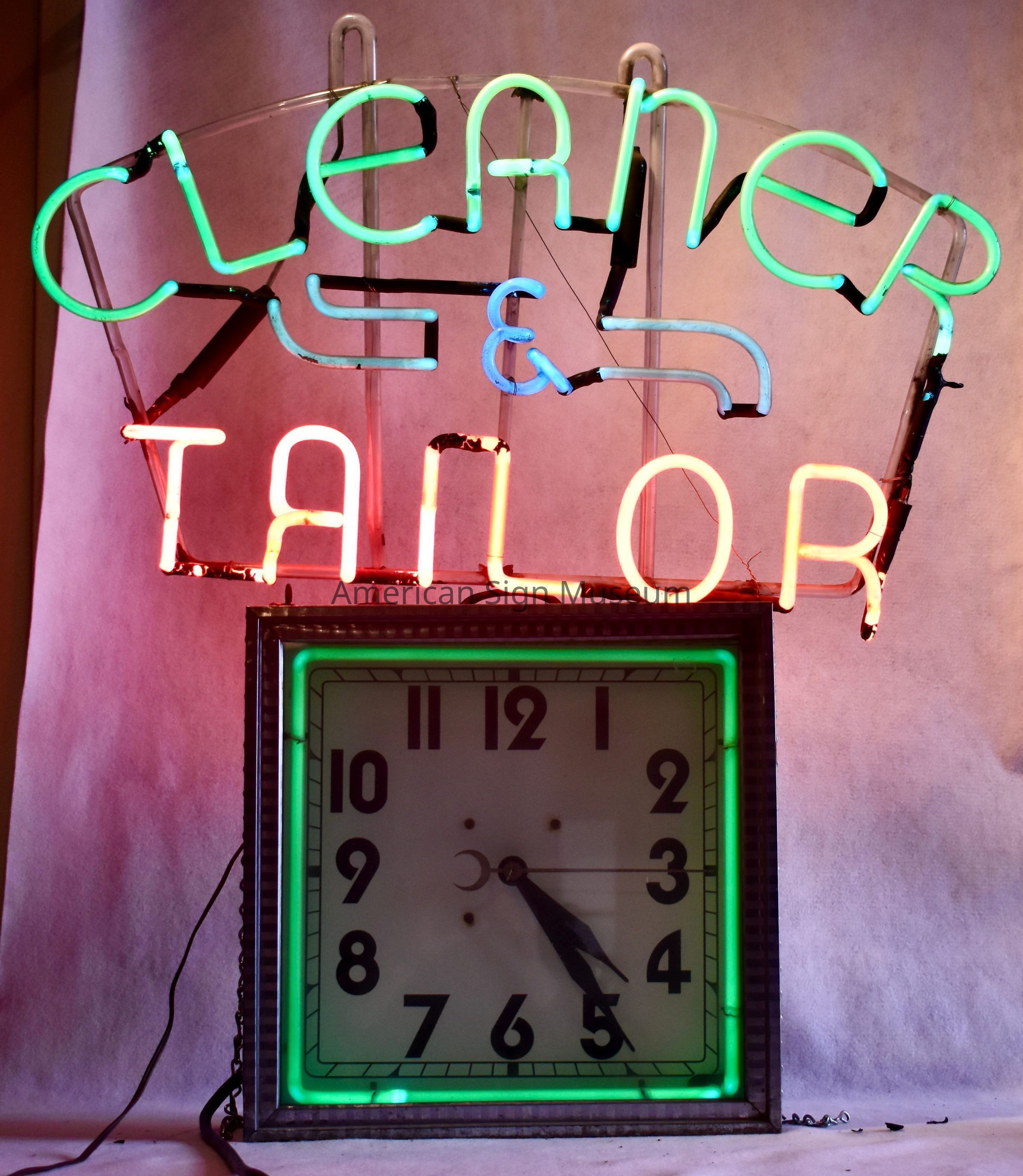 Skeleton neon sign with neon clock reads, "CLEANER & TAILOR" in red, white, blue and green. Square clock has stainless steel frame on metal cabinet. A green border tube outlines the inside of the clock cabinet. Neon sits in two housings on top of the clock cabinet.Collection