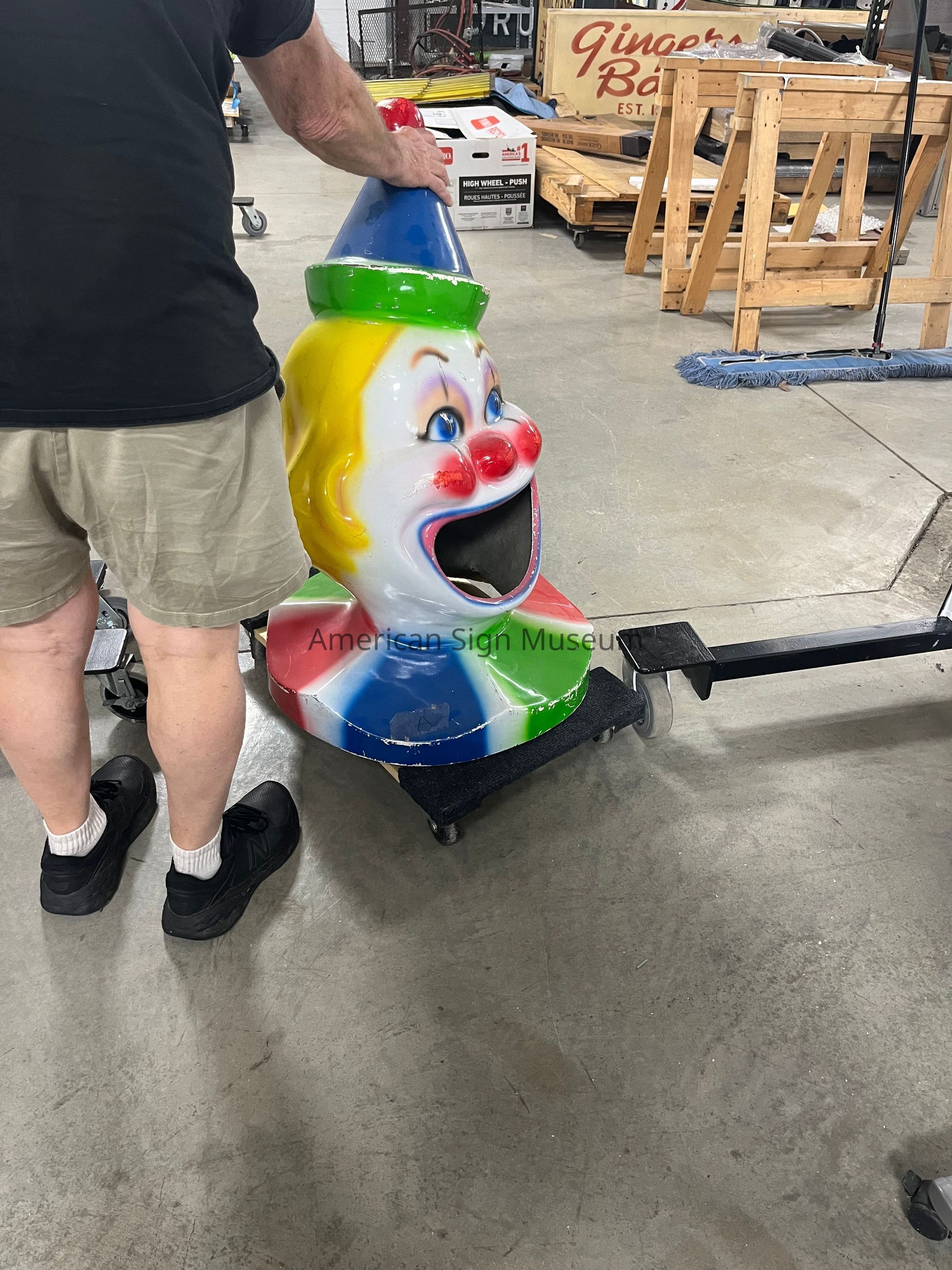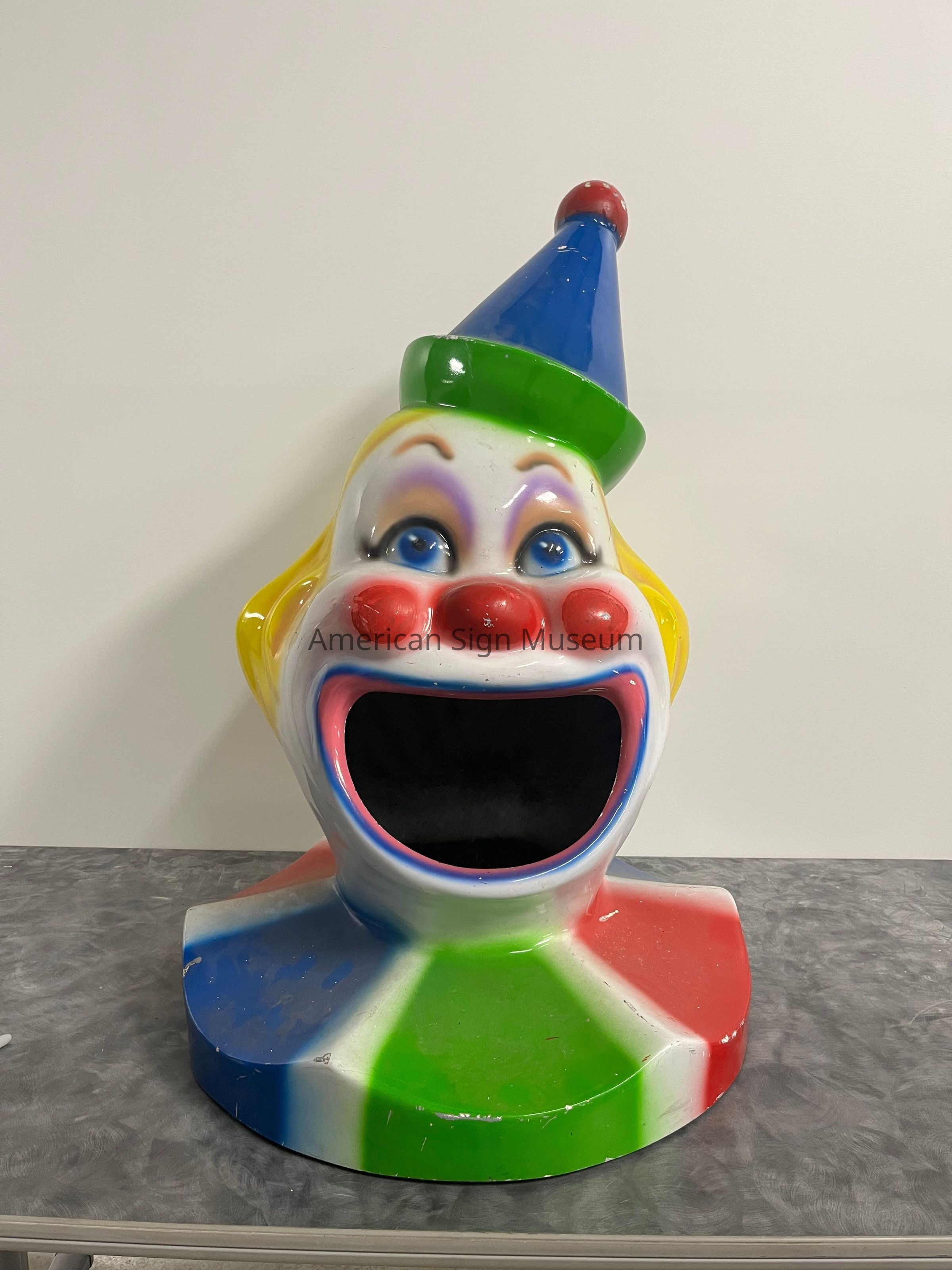 Garbage can lid shaped to look like a clown