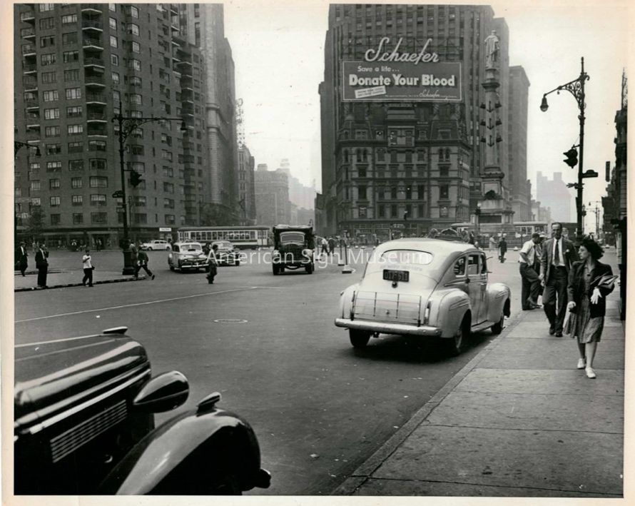 B&W photograph of Schaefer Beer sign at Columbus Circle sign is ad for Red Cross reads "Save a life...Donate Your Blood."Collection