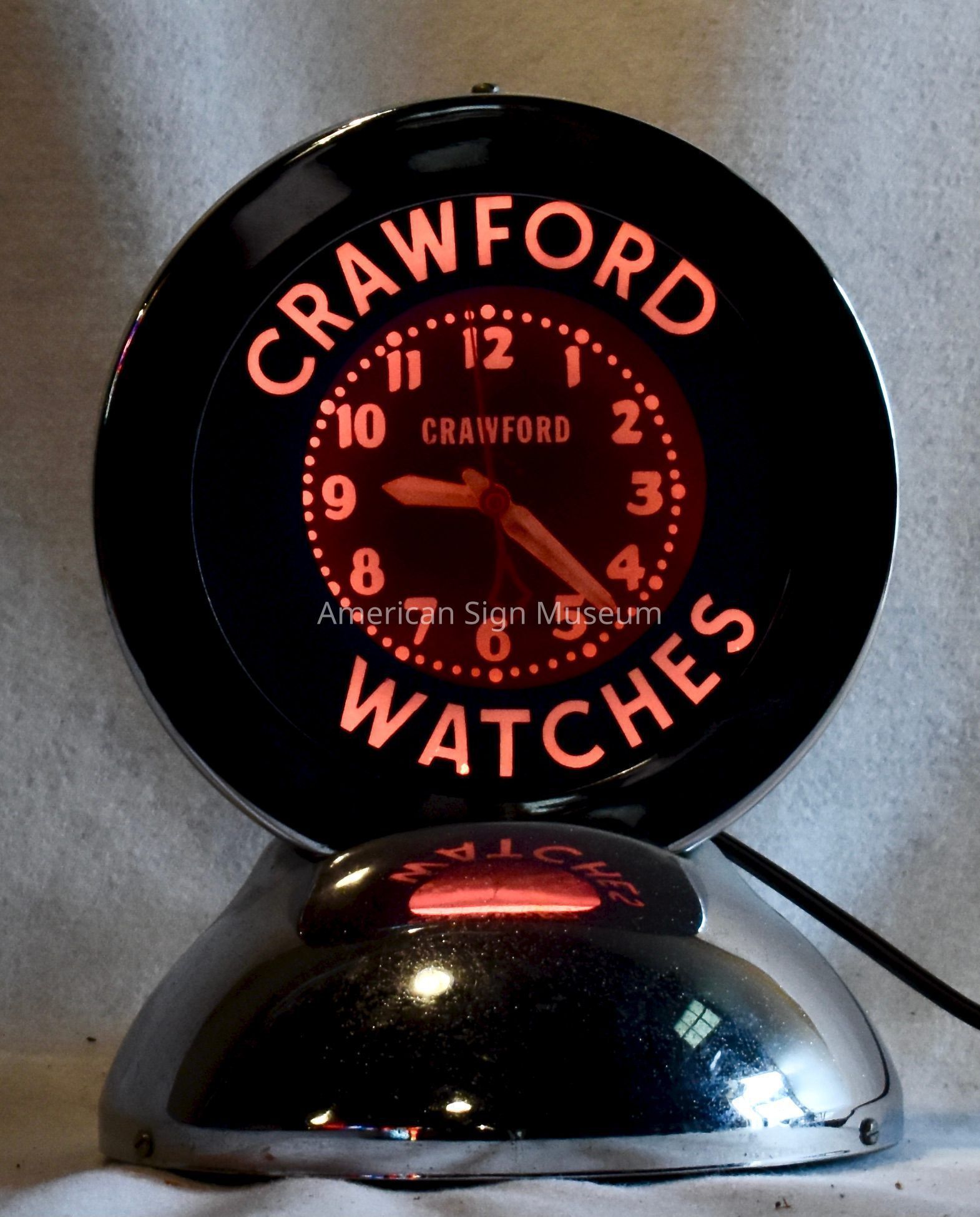 Glo-Dial counter top neon clock is stainless steel bezel mounted on a half-moon stainless steel base. Glass face copy --"Crawford Watches"-- is reverse screenprinted; clock face is screenprinted and recessed. Border tube is mounted behind glass face.Collection