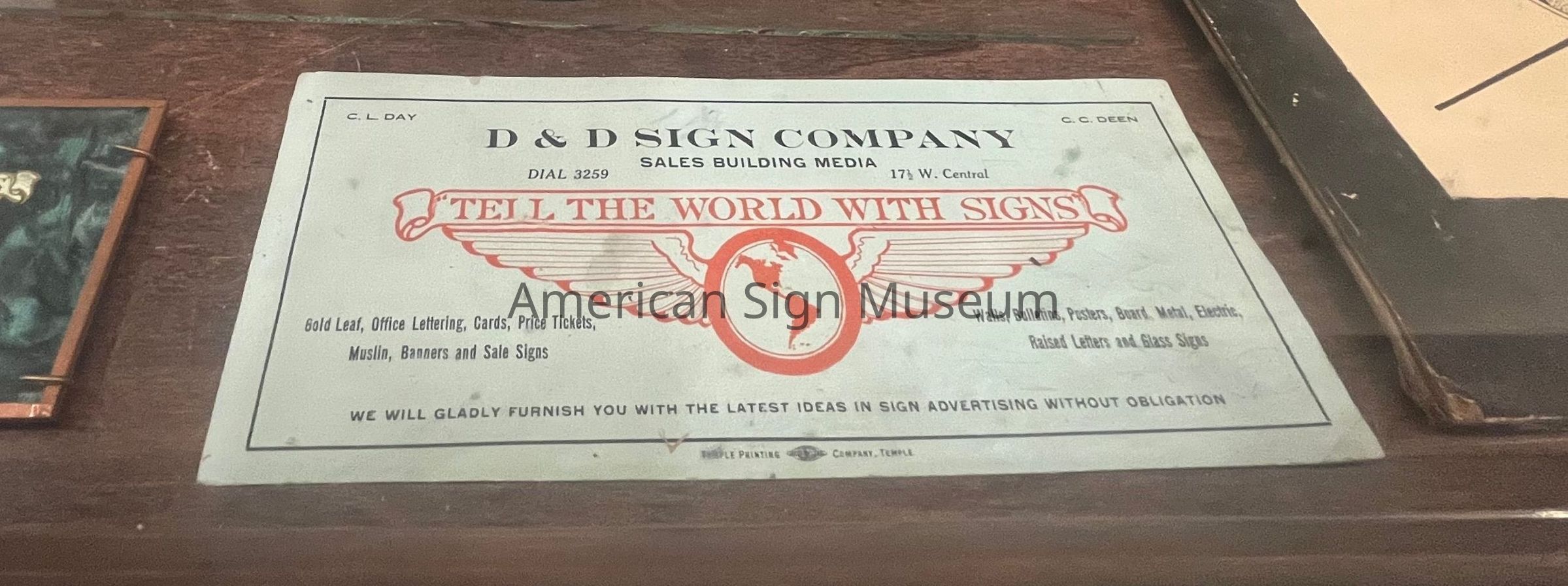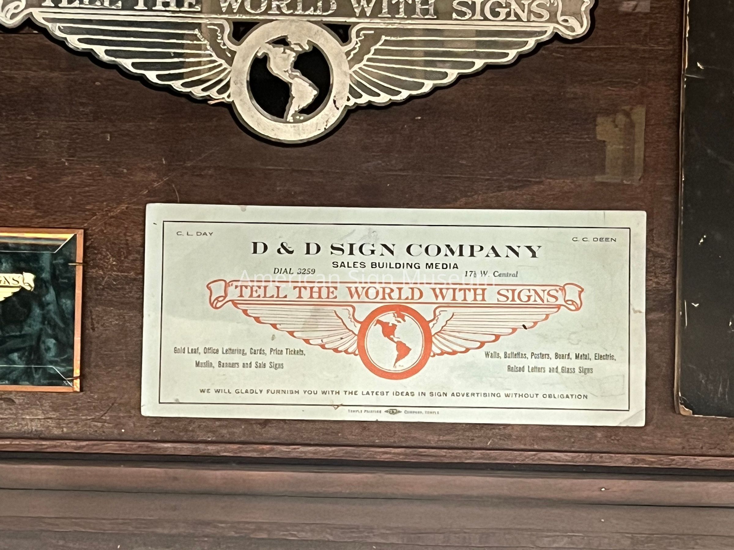 D&D Sign Company blotter (with "Tell the World with Signs" logo). Two-color on blue stock.Collection