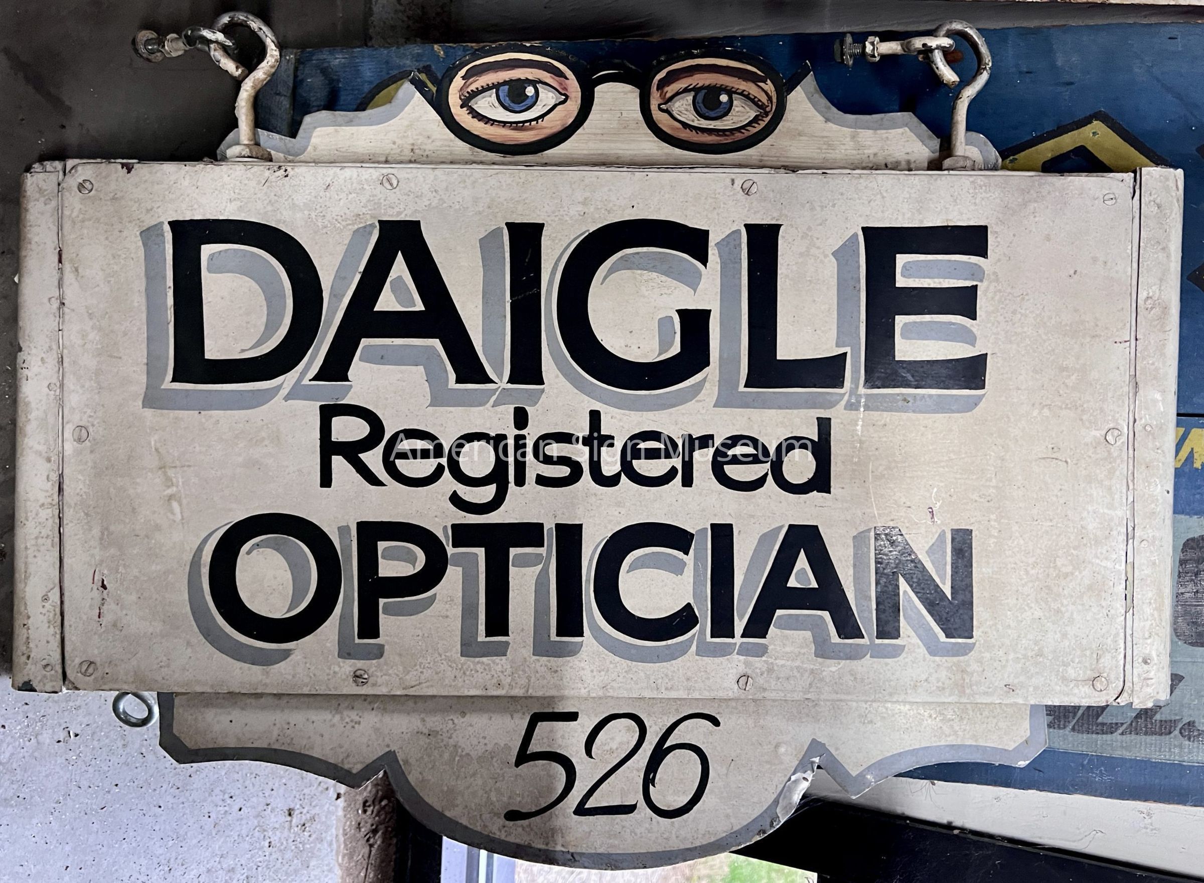 Double-faced metal sign that is hand-painted, with a cream-colored background and reads, "DAIGLE Registered OPTICIAN 526" in dark blue lettering with light blue drop-shadowing. It has a set of eyeglasses painted into a decorative motif at the top of the sign. It has mounting hardware attached to the top.Collection