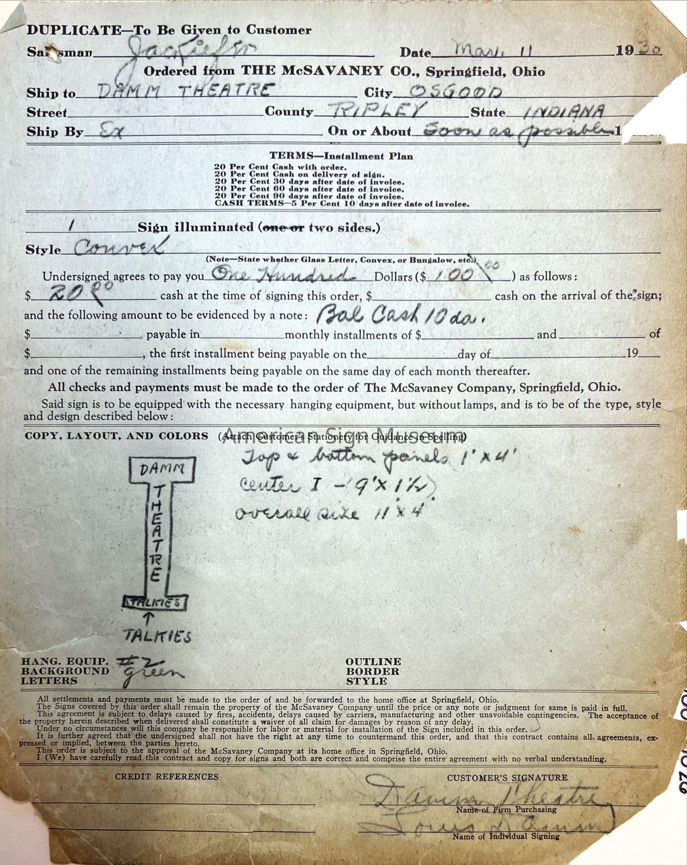 Created by the McSavaney Company of Springfield Ohio for the Damm Theatre in Osgood, Indiana. 1 illuminated side, convex style. Top and bottom panels read "Damm" and "Talkies", center vertical section reads "Theatre".