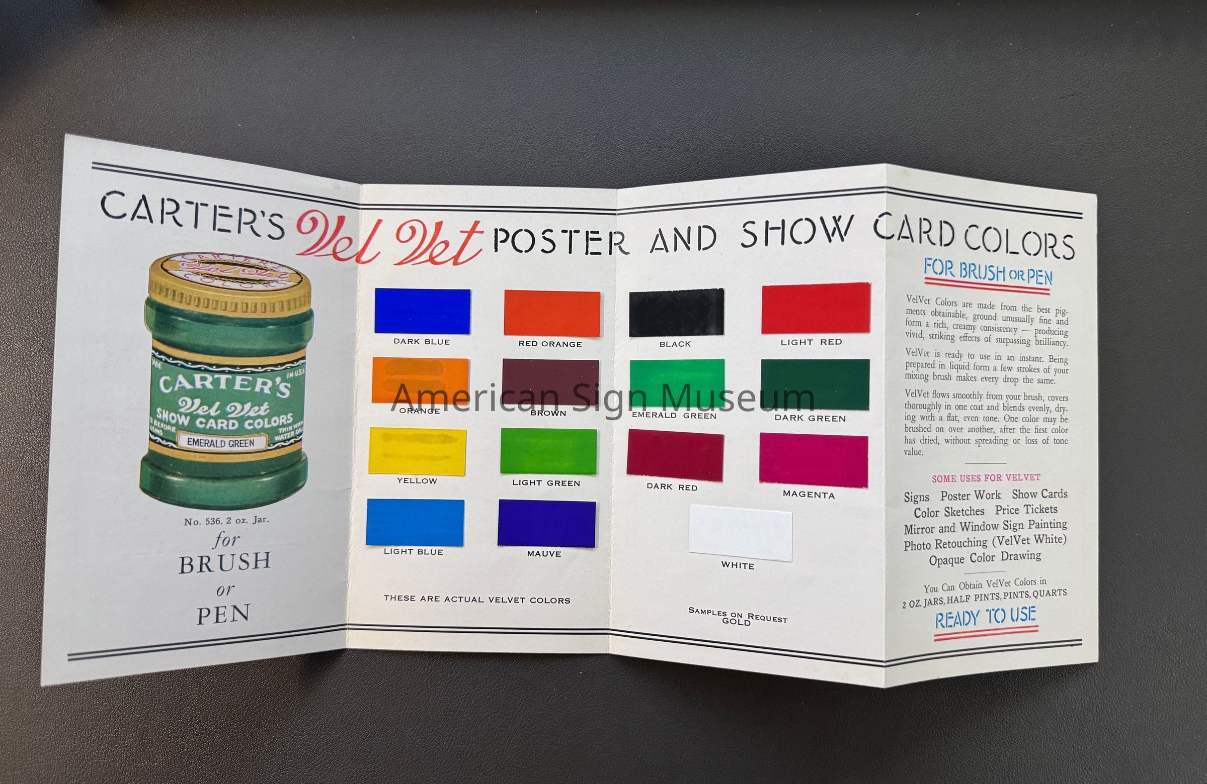 Carter's Ink Company was founded in 1858 by William Carter as William Carter Company, first headquartered in Boston, MA. They were one of the largest ink distributors in the nation. Avery Dennison acquired Carter's in 1975. This pamphlet advertises their line of Vel Vet paints for show cards, often called, "Show Card Colors." The line is described as, "the best pigments obtainable, ground unusually fine and form a rich, creamy consistency." Inside of the four-panel pamphlet, there is a rich display of 15 actual colors for a sign-painter to select from.Collection