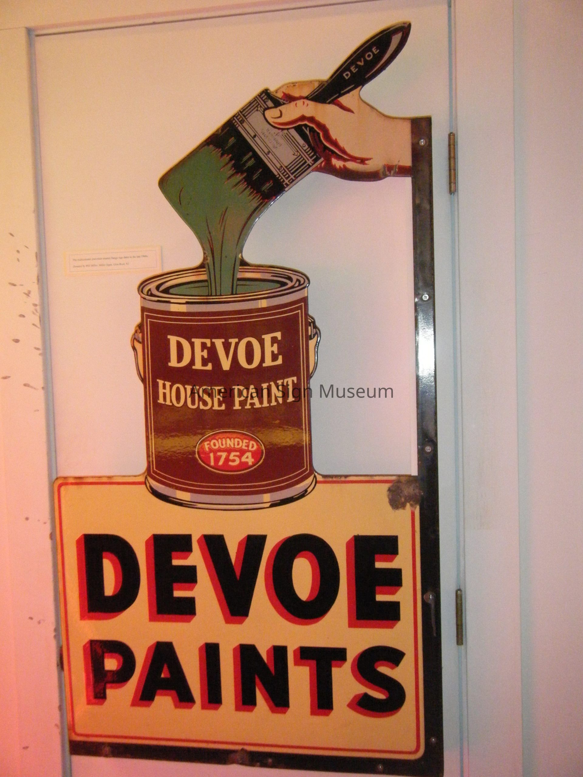 Double-faced, porcelain enamel projecting sign for Devoe Paint is multi-colored and die-cut.Collection
