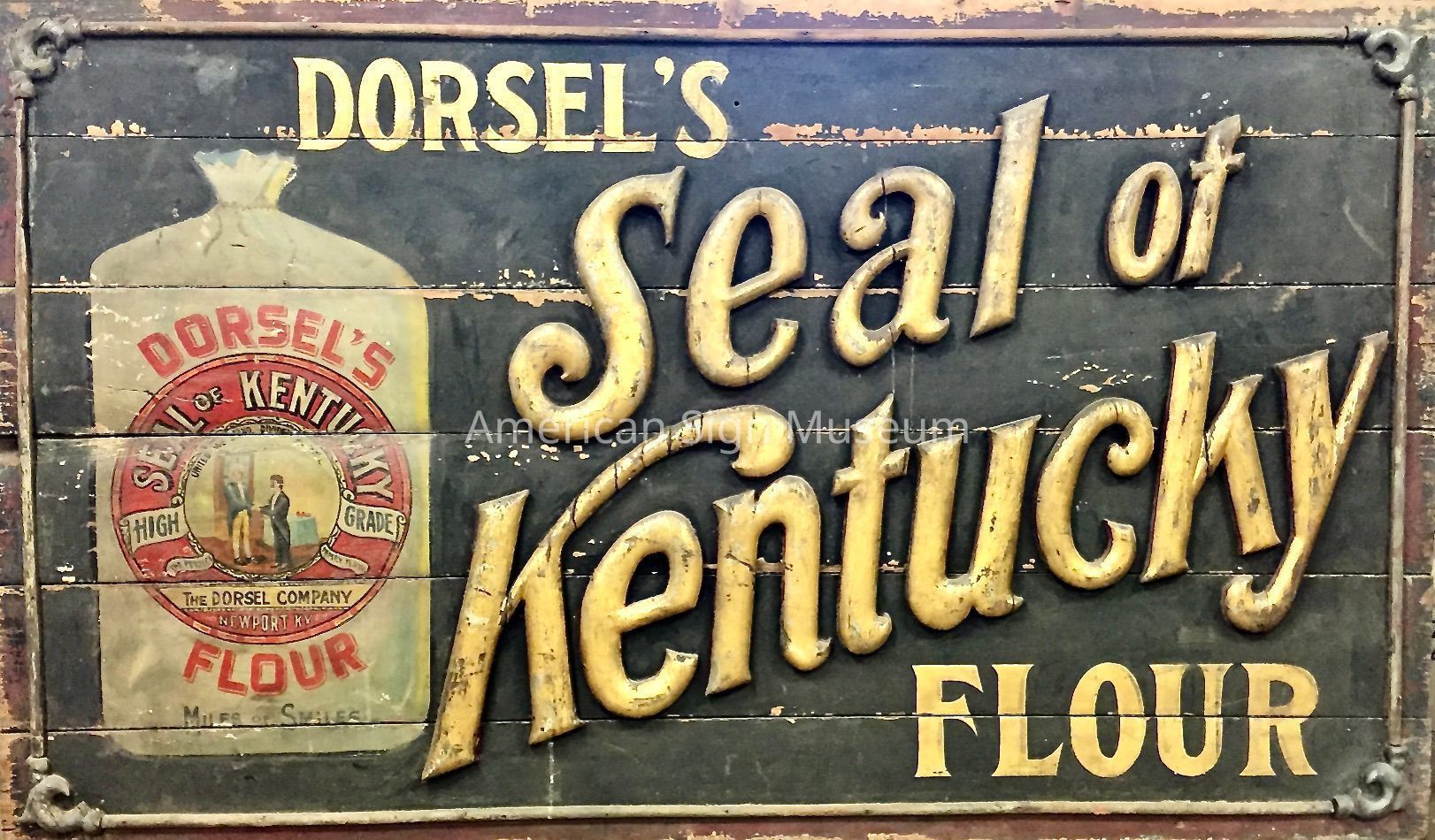 Painted and smalts wood sign has hand-carved and gilded borders and corners as well as main copy reading, "Seal of Kentucky." Painted pictorial depicts Dorsel's Flour bag. Reported to have originally hung indoors and possibly at the Dorsel's factory in Newport, KY but this is unconfirmed.Collection