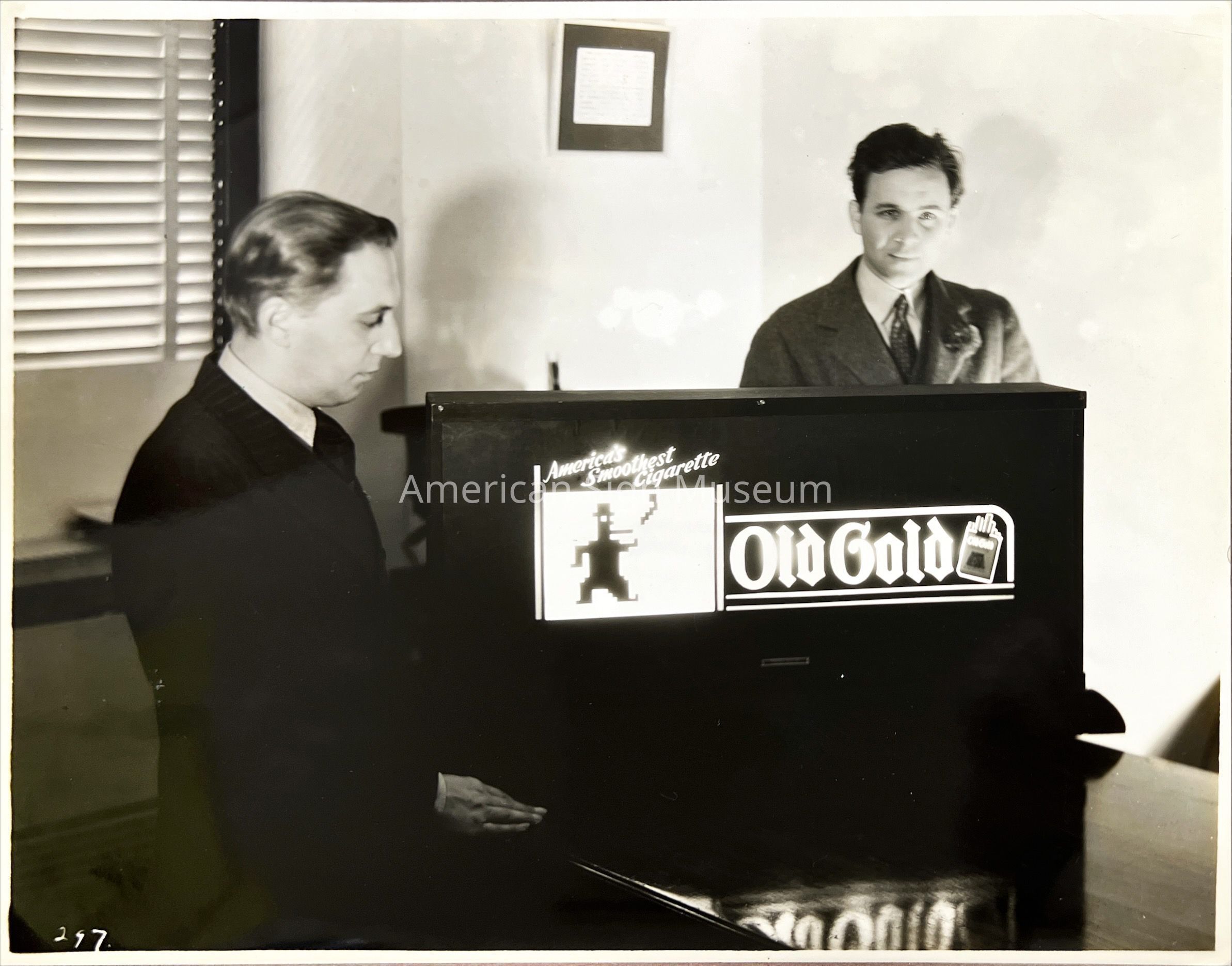 B&W photograph of Douglas Leigh and Otto Soglow with Old Gold Cigarettes Epok sign model.