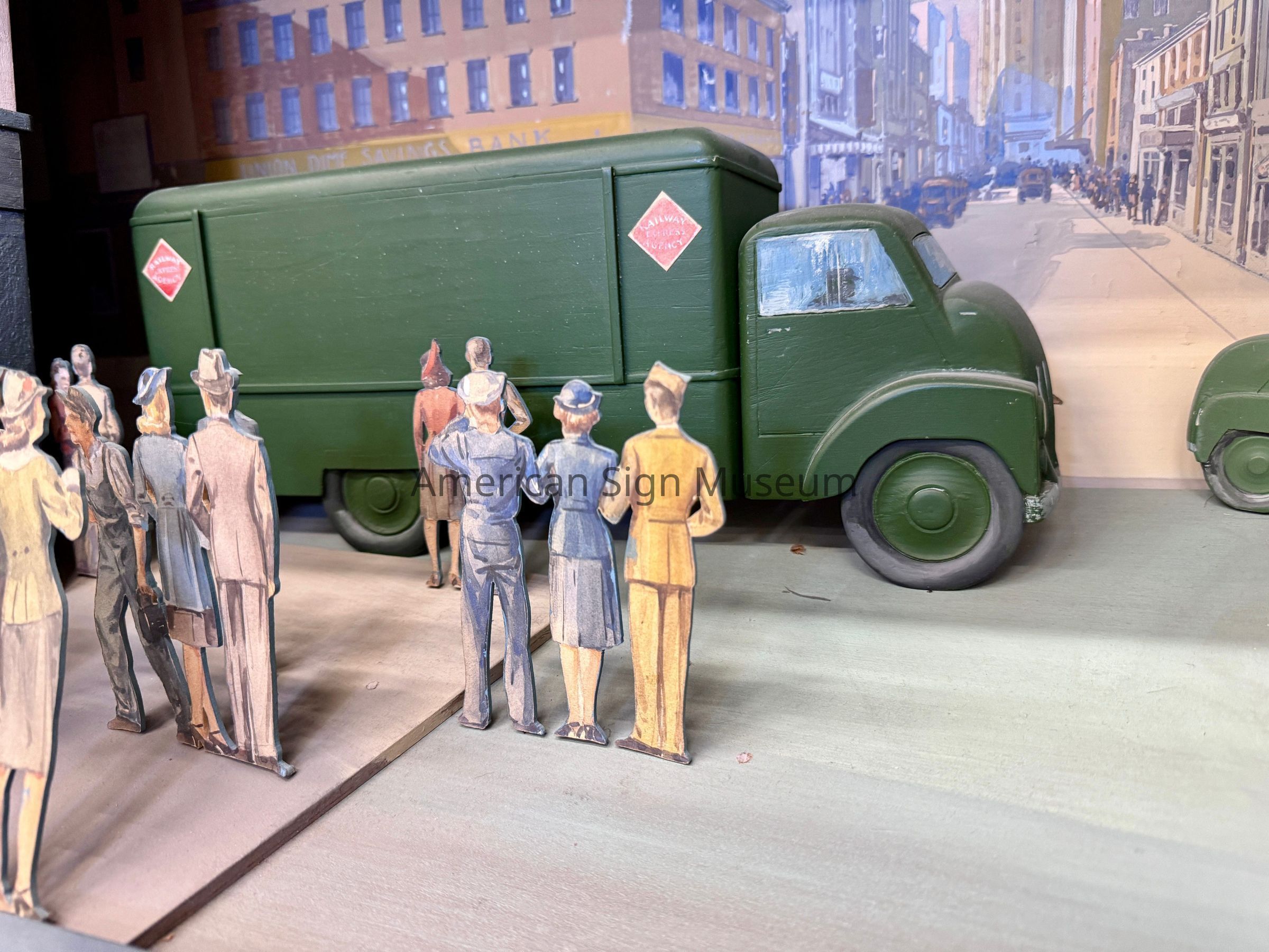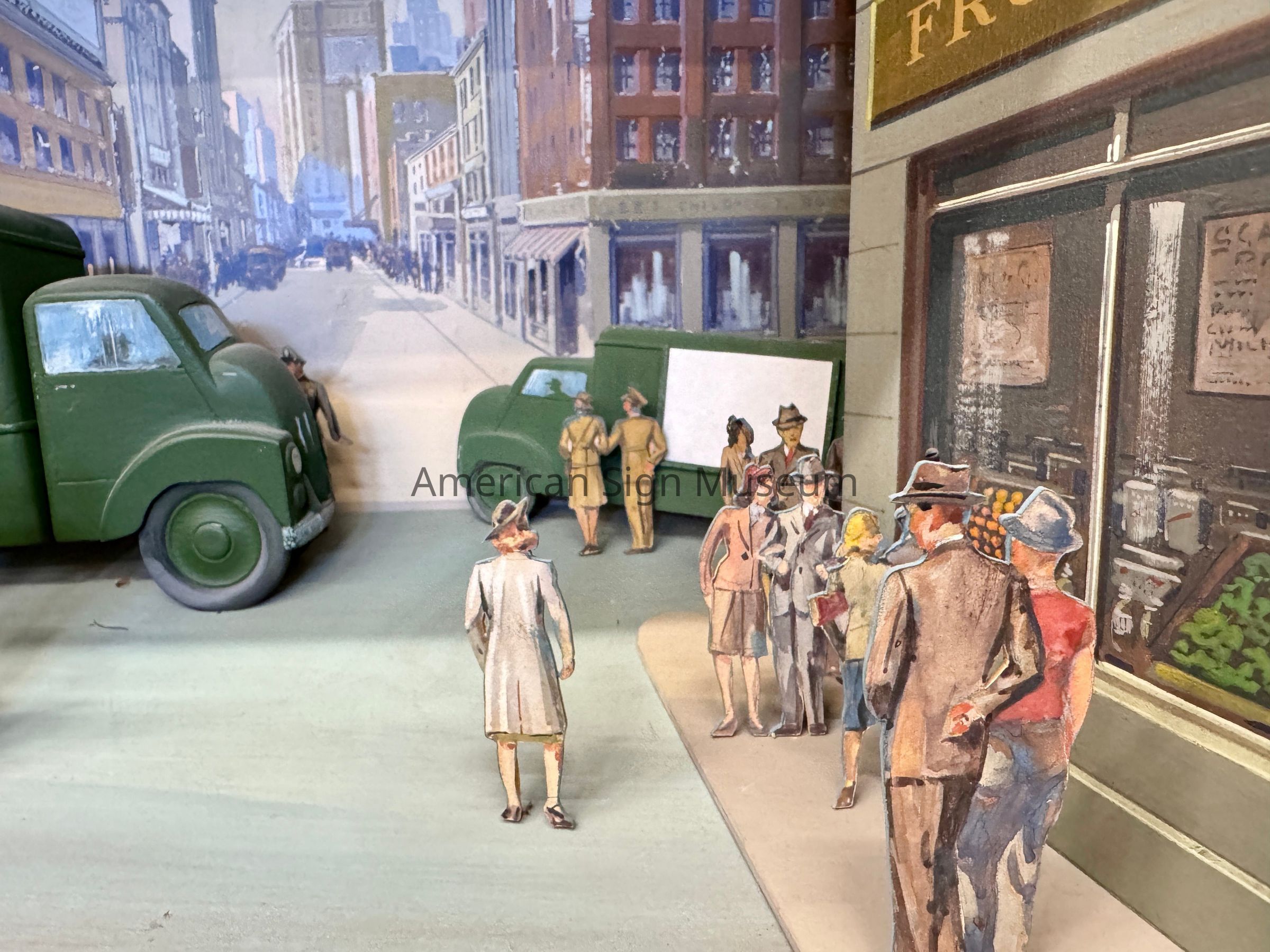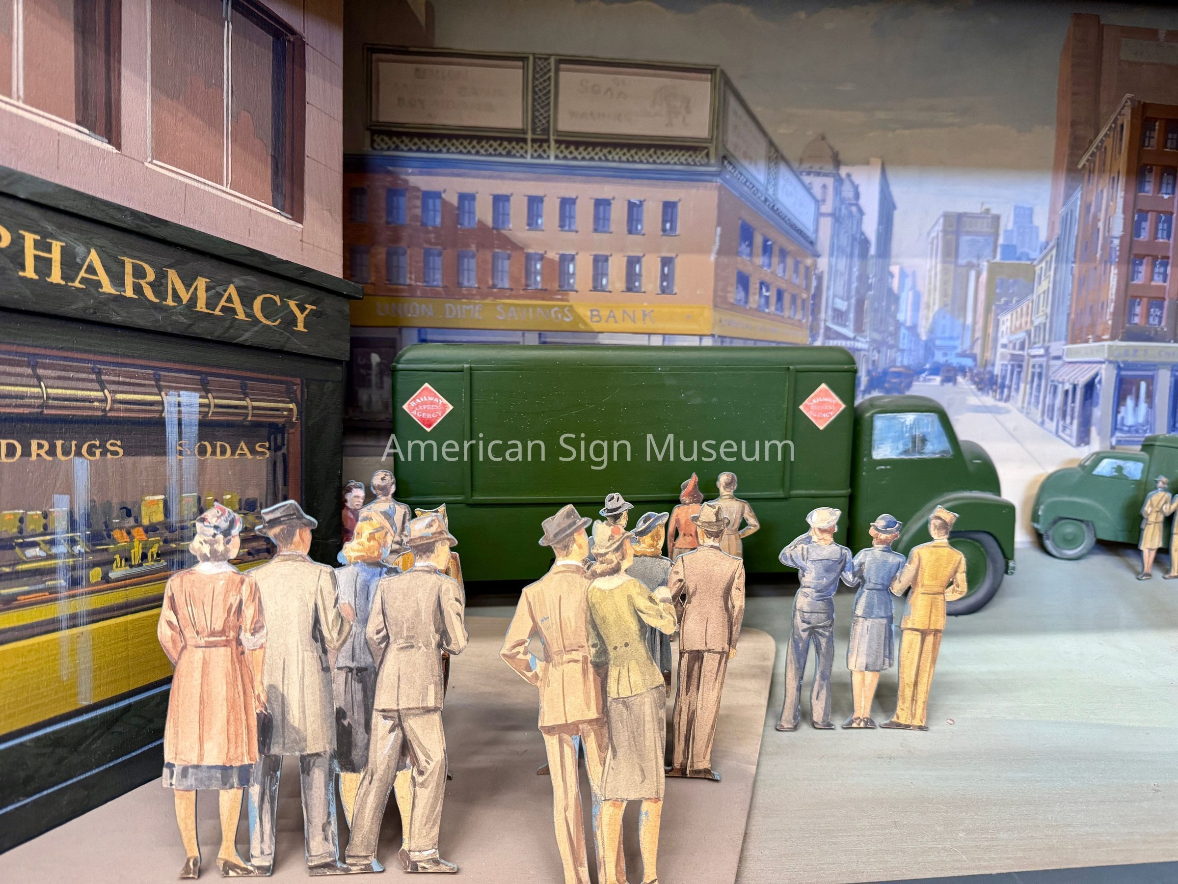 A 3D architectural model/diorama made by Douglas Leigh, famed Broadway sign designer. The diorama features hand-painted figures and storefronts as well as a hand-carved, painted truck. The display was created for a presentation to secure the leasing rights for the ads on the sides of Railway Express Agency trucks.Collection