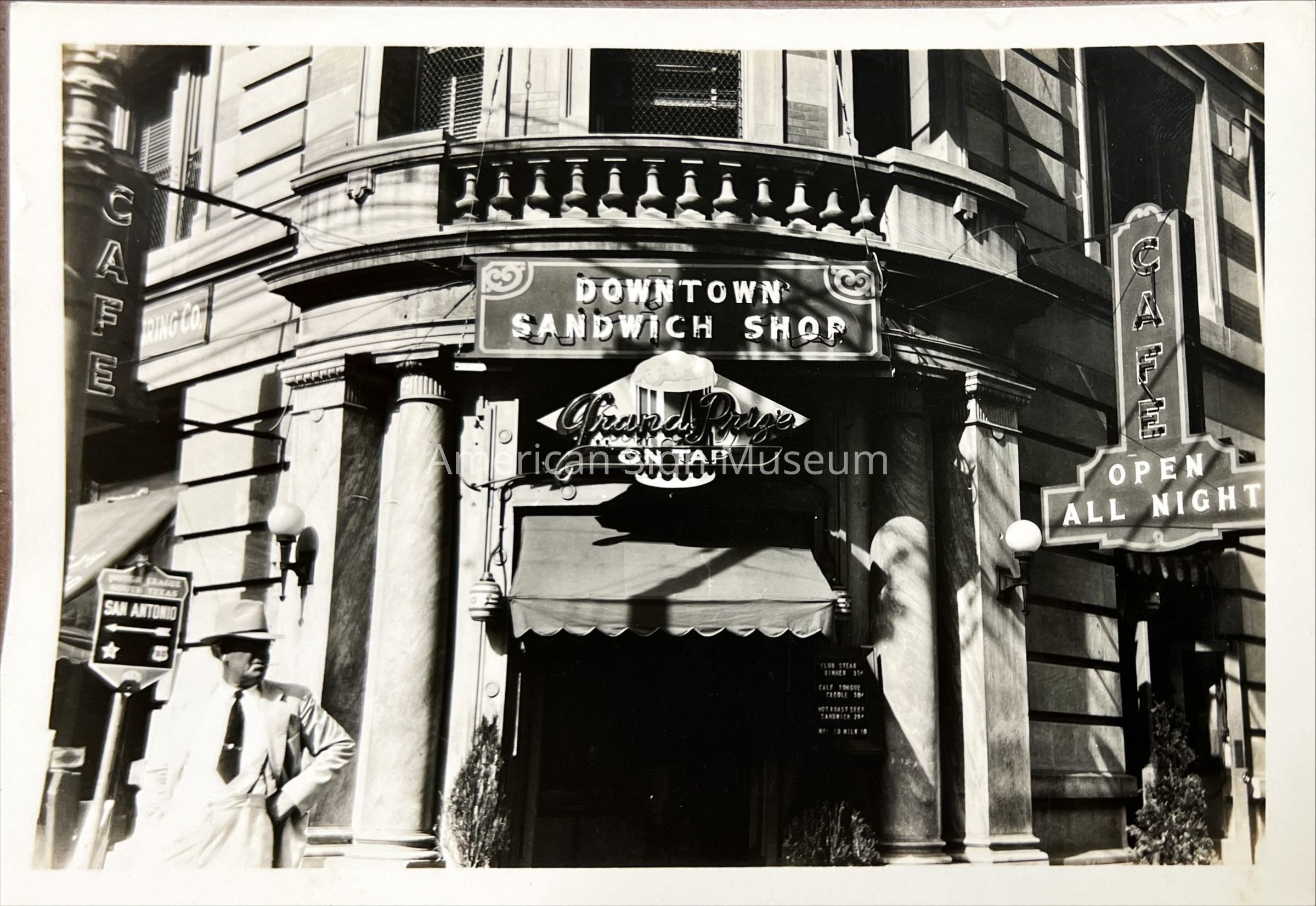Photograph of early neon signs 1930-1940s with figure - Downtown Sandwich Shop - Grand Prize on Tap.