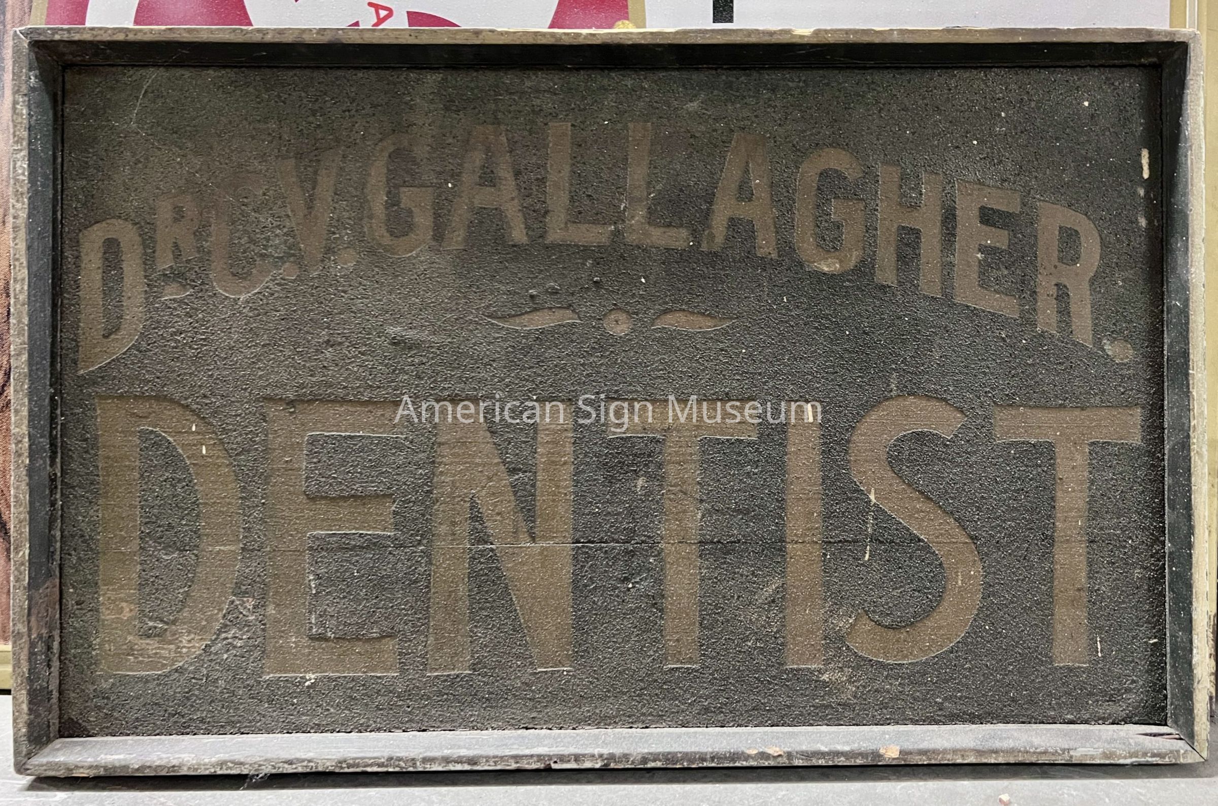 A small wooden sign with gold lettering on a dark smalts background that reads, "Dr. C.V. Gallagher Dentist."Collection