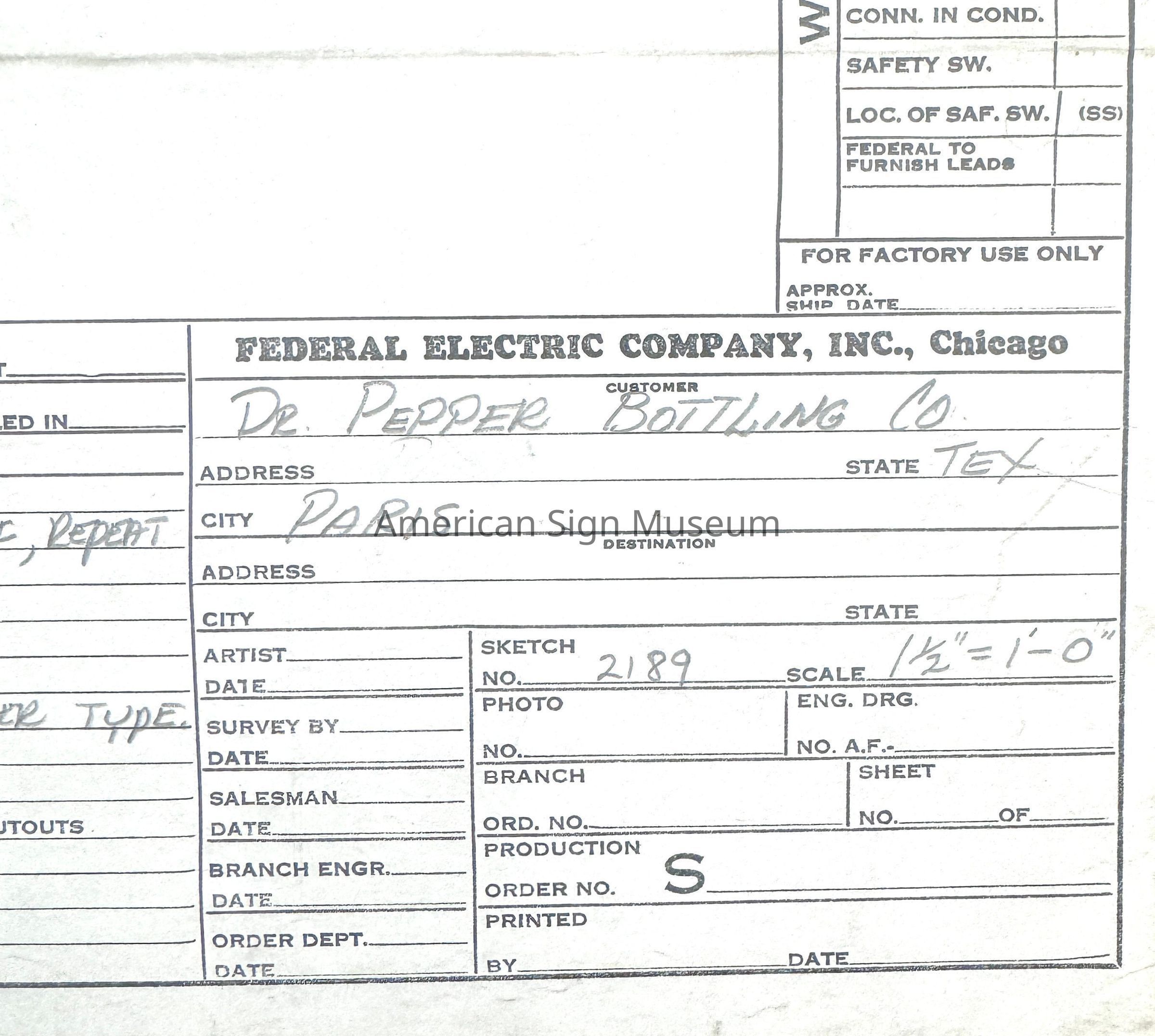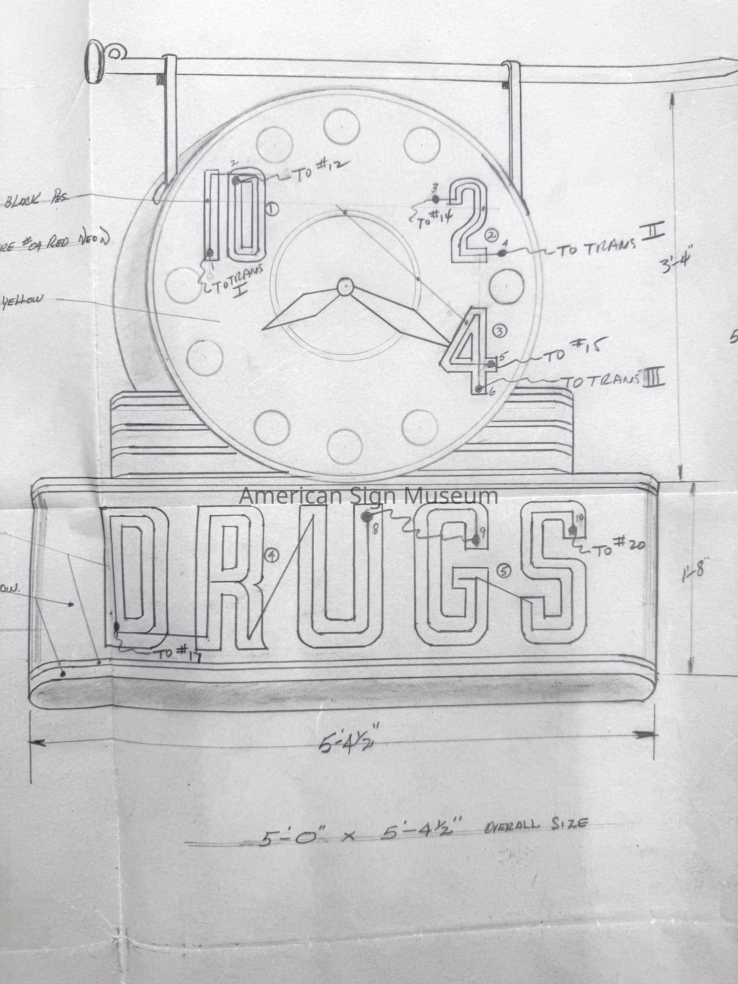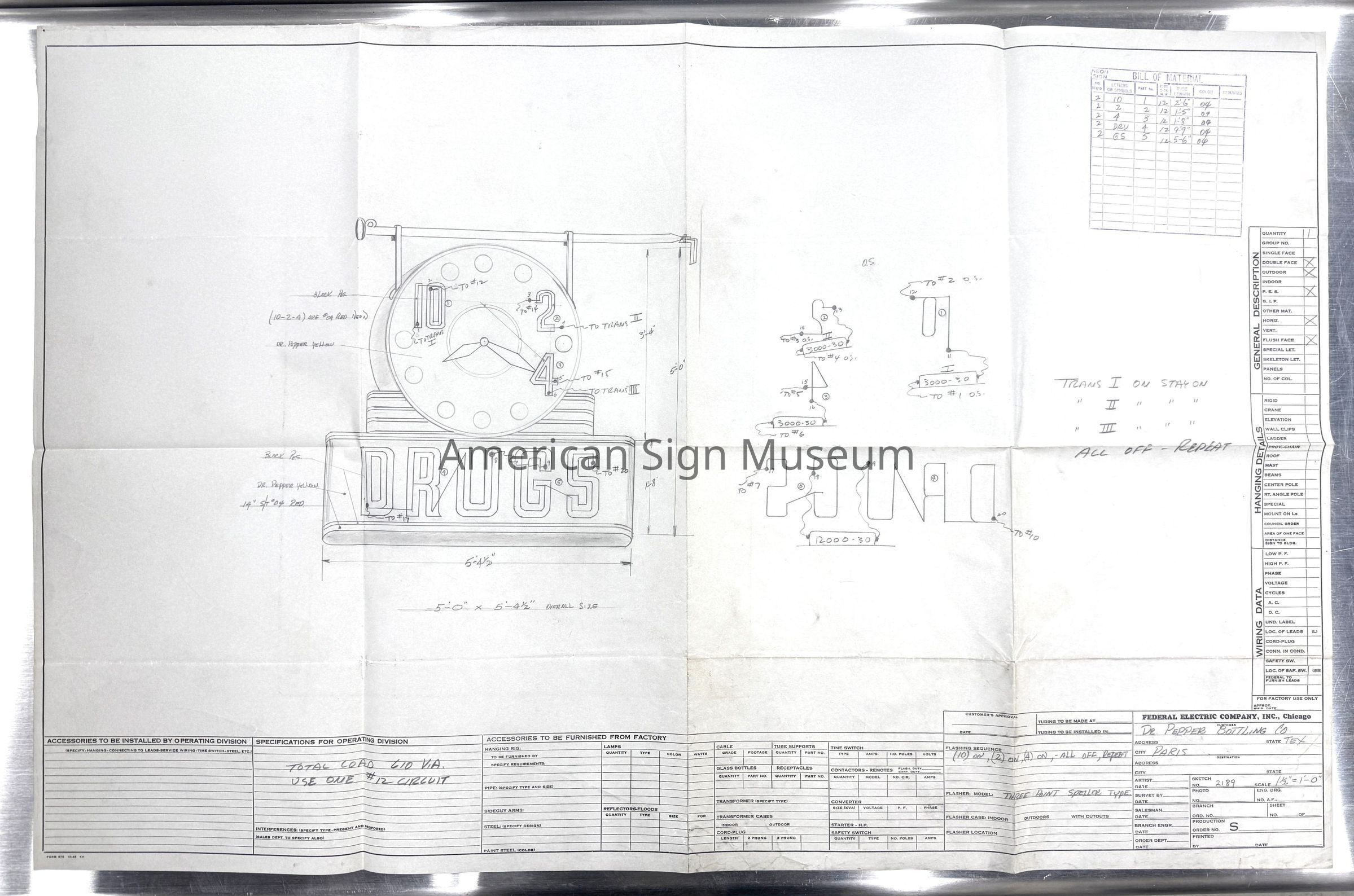Dr. Pepper "DRUGS" sign blueprint featuring a neon clock blueprint of job for Paris, TX by Federal Electric Company, Inc., Chicago, IL.(See also 2001.0057.0002-0010)Collection