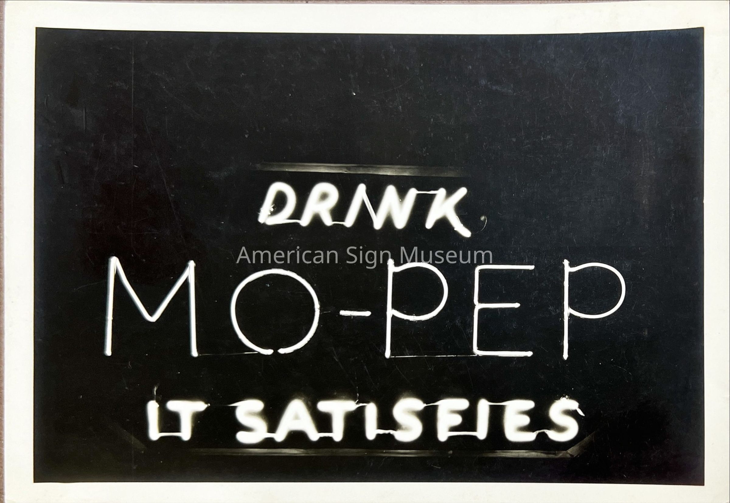 B&W photograph of early neon sign 1930-1940s - "Drink Mo-Pep It Satisfies." Photo was taken at night.
