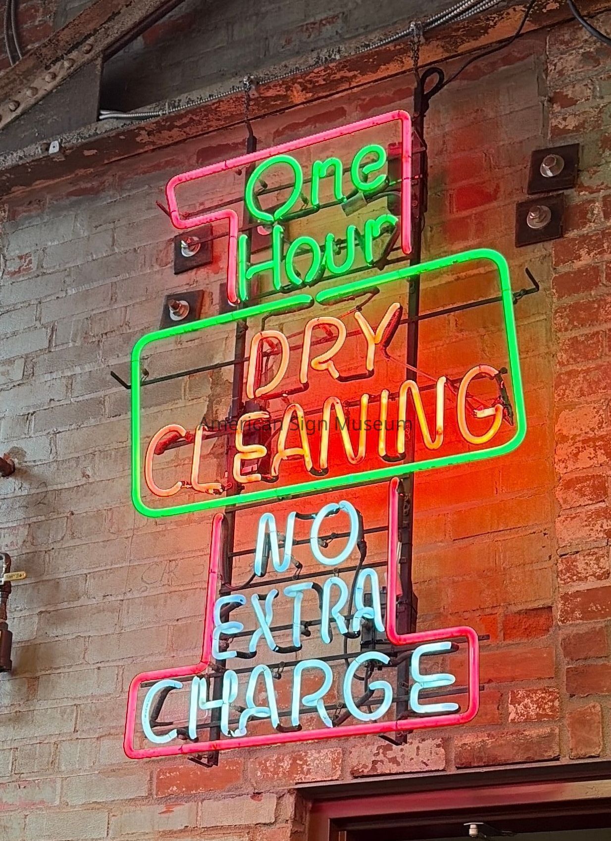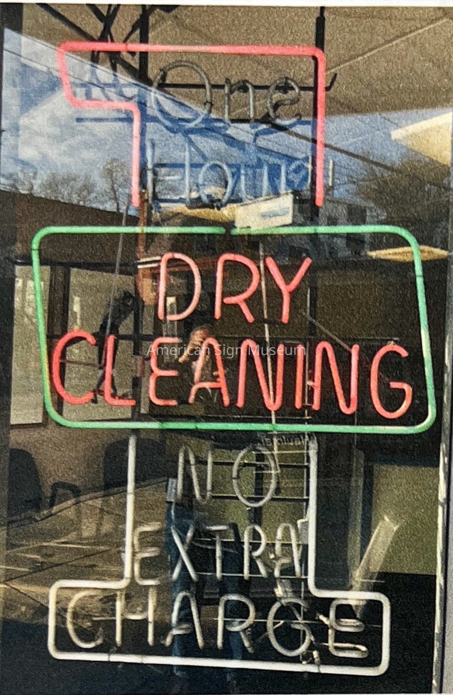 One skeleton neon sign that was part of a pair originally displayed in windows at Deluxe Dry Cleaners in Cincinnati, OH. It's dominate shape is the number 1, inside of which is lettering that reads, "One Hour," "Dry Cleaning," and, "No Extra Charge." Neon colors are red and green