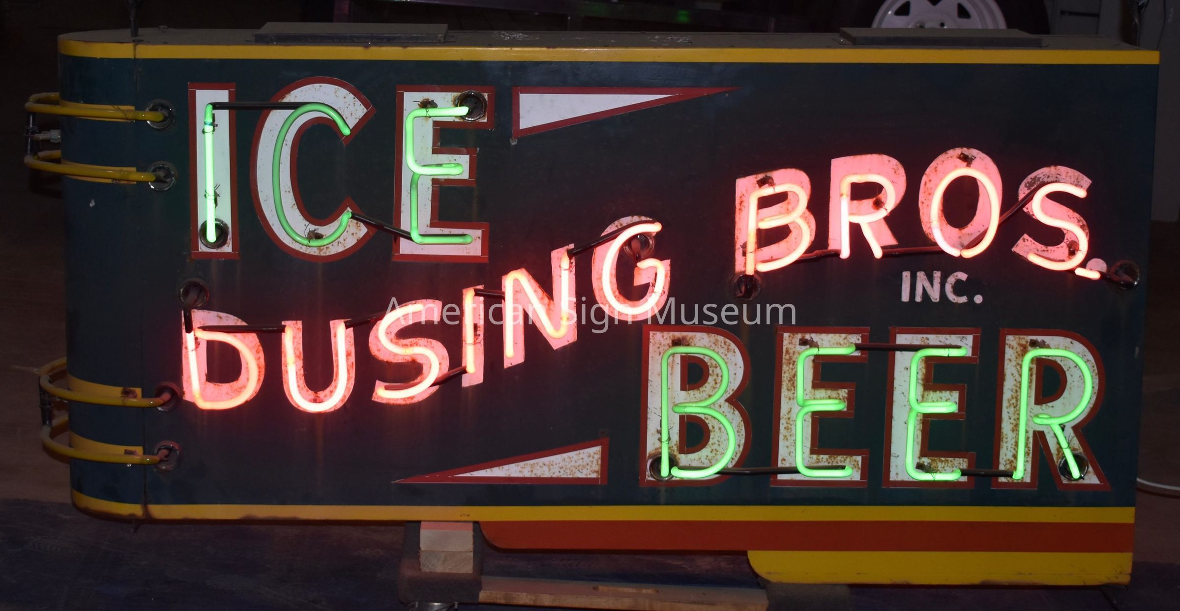 A late 1940s double-faced, neon sign that advertised the Dusing Brothers Ice Manufacturing business which operated from 1928 to 2017 in Elsmere, KY. The sign was designed to be attached directly to a building's facade and display at a 90 degree angle, therefore one end is flat while the other is rounded into a bullnose shape. It has a dark background and yellow top and bottom outline, in addition to yellow bands wrapping around its bullnose end. Along the bottom, there is a horizontally-stepped design.Collection