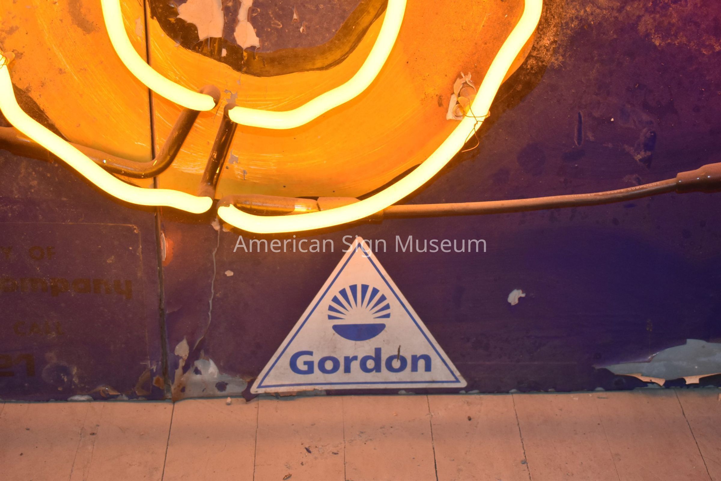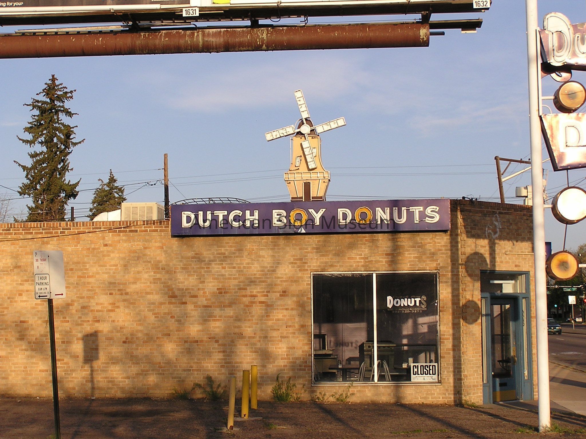 Dutch Boy Donuts sign is actually two sheetmetal, neon-illuminated sections including a long cabinet sign with a rotating windmill mounted center top. The graphics and text are painted; the "O's" in the text are made out to be donuts.