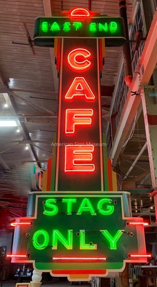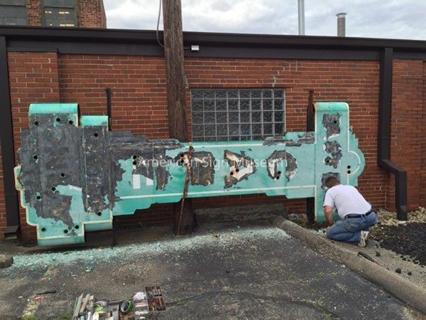 Circa 1935 double-faced, hand-lettered neon sheetmetal sign.Collection