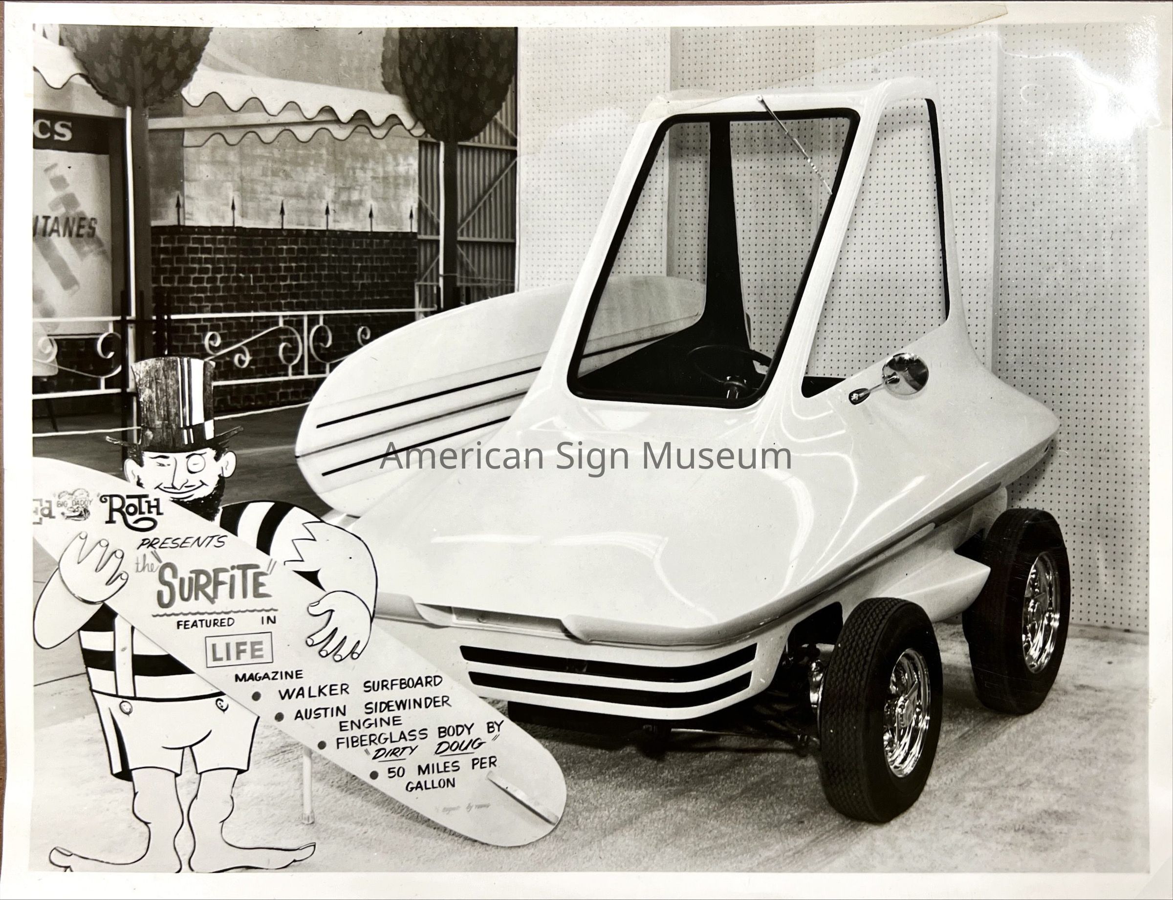 photograph of one of Ed Roth's vehicles sign in photo reads "Ed 'Big Daddy' Roth presents the 'Surfite' featured in Life Magazine"