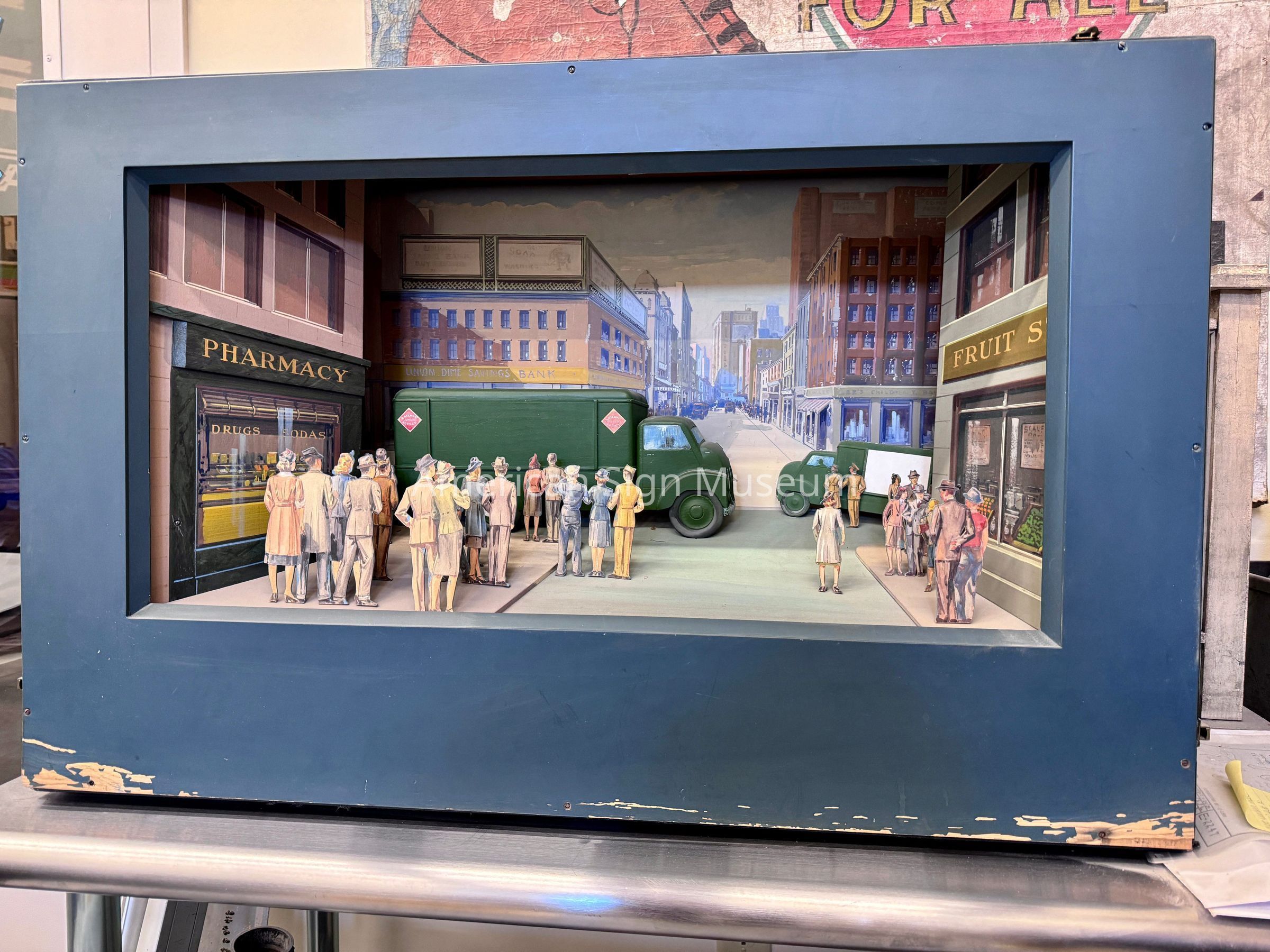 A 3D architectural model/diorama made by Douglas Leigh, famed Broadway sign designer. The diorama features hand-painted figures and storefronts as well as a hand-carved, painted truck. The display was created for a presentation to secure the leasing rights for the ads on the sides of Railway Express Agency trucks.Collection