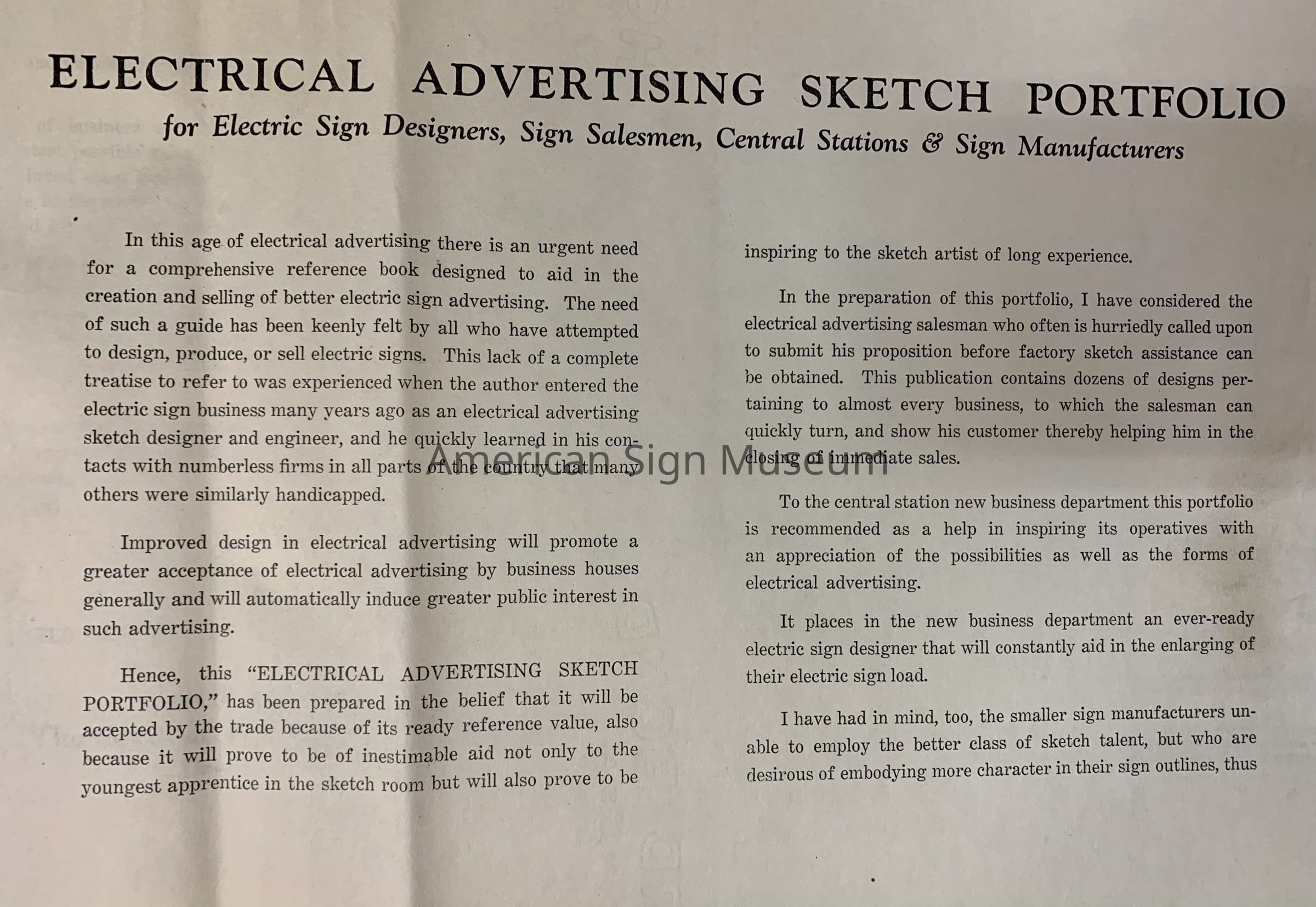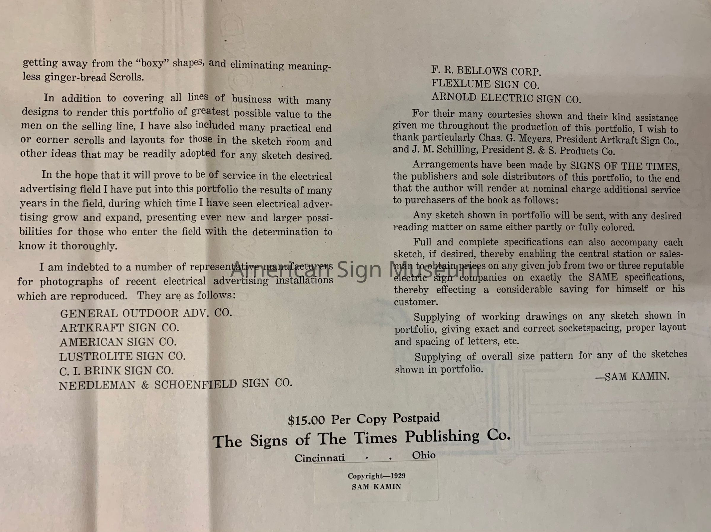 Electrical Advertising Sketch Portfolio. No. 1 by Sam Kamin. Published by The Signs of the Times Publishing Company, Cincinnati, OH: 1929. Looseleaf hardbound; n.p. 149 plates with some halftone photos.Collection