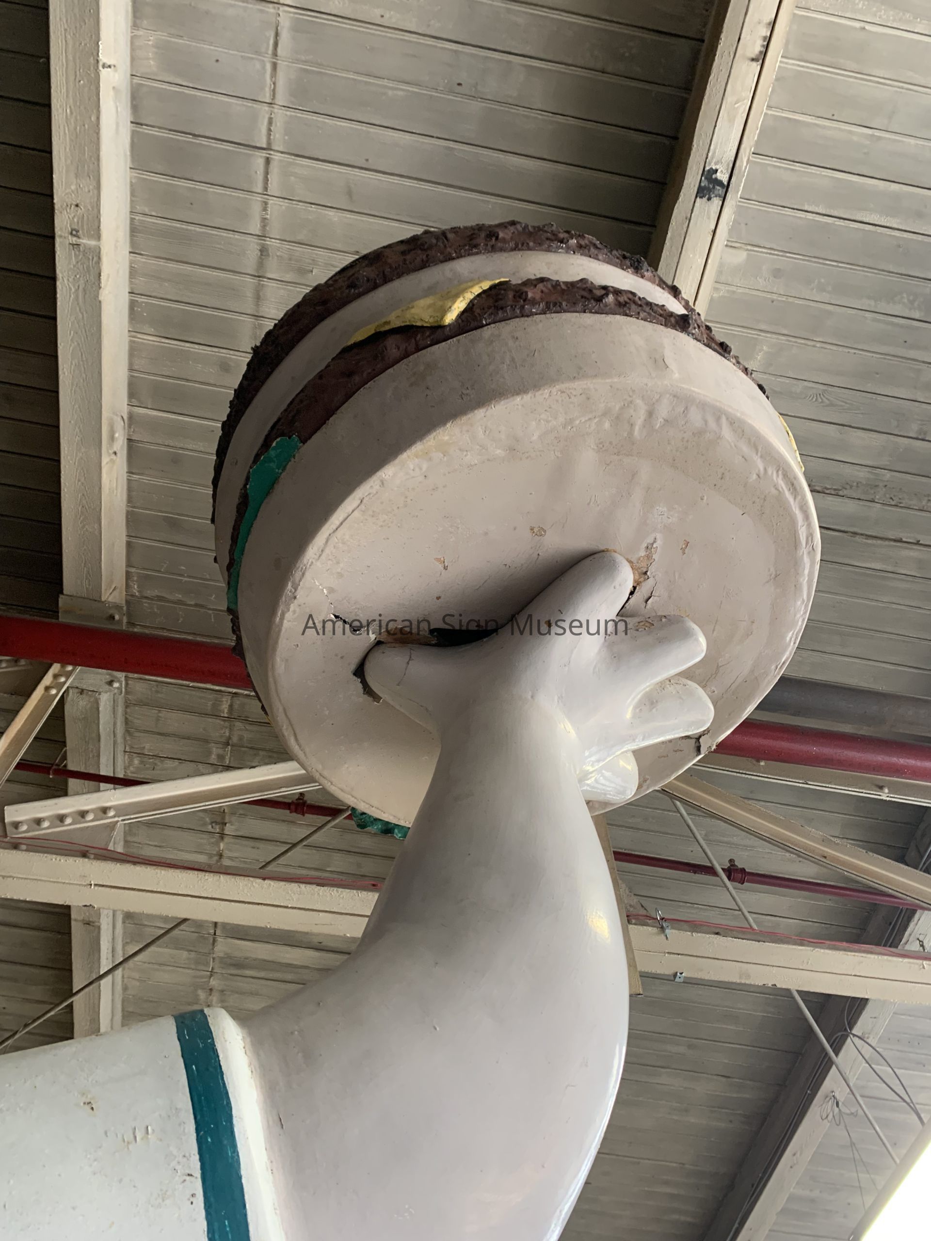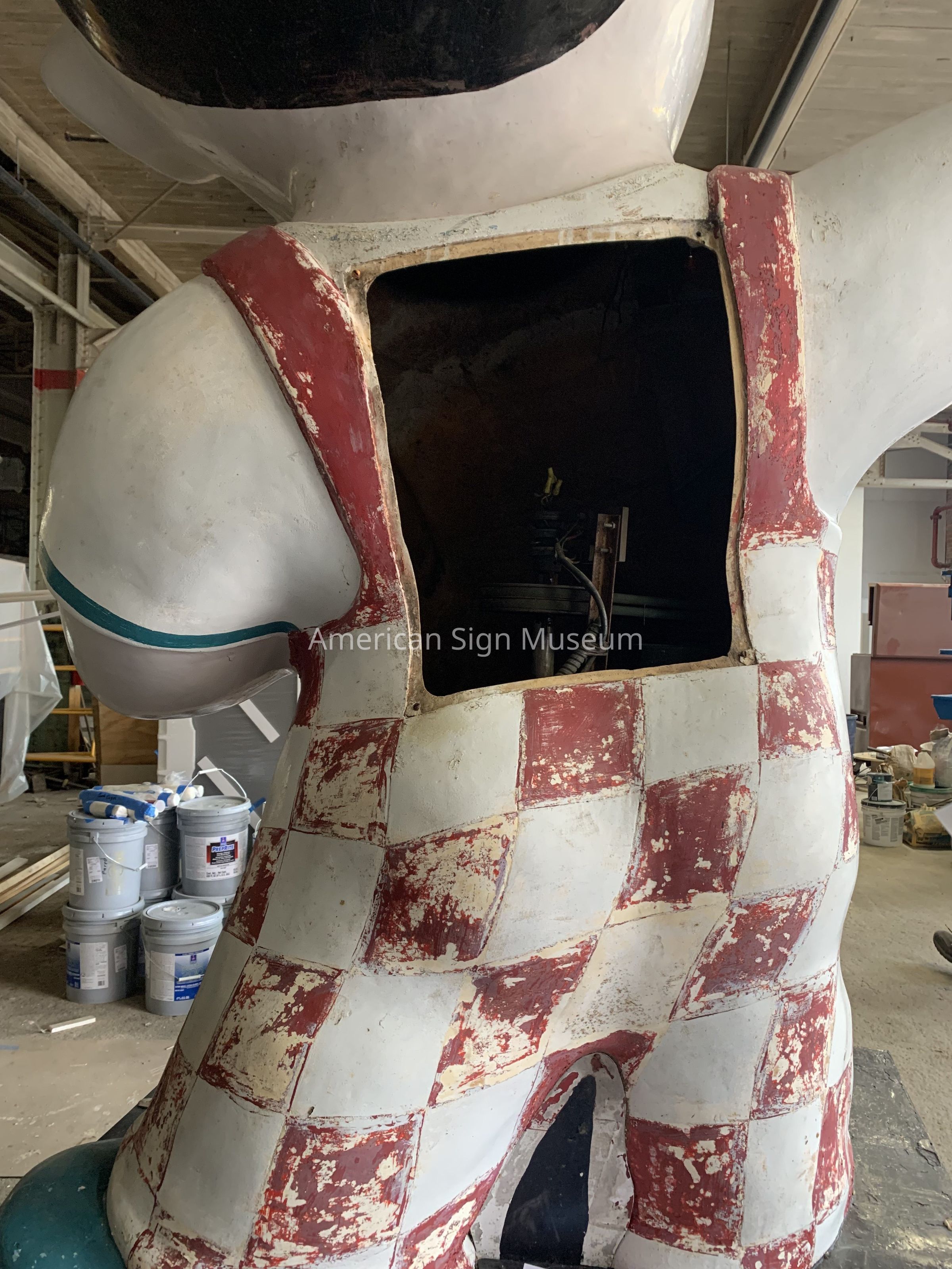The Elias Brothers version of the iconic Big Boy fiberglass three-dimensional figure is mounted on a steel base and originally rotated. Though the location began operation in the 1970s, its statue design looks to be from the 1950s - it is possible the restaurant used an older statue from another location.